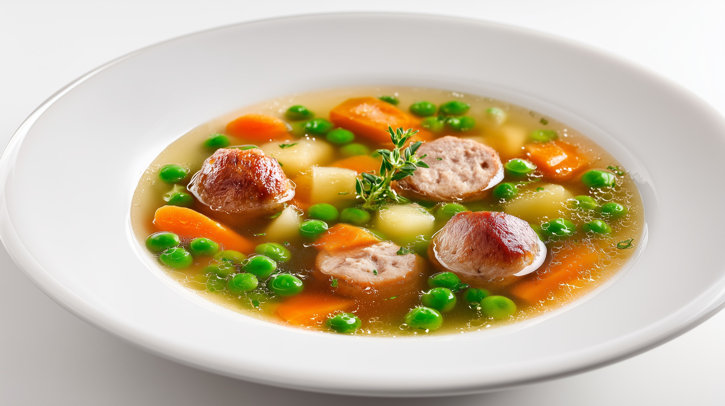 - Die Erbsen und die angebratenen Bratwurstscheiben zur Suppe geben und weitere 5 Minuten bei niedriger Hitze mitgaren.