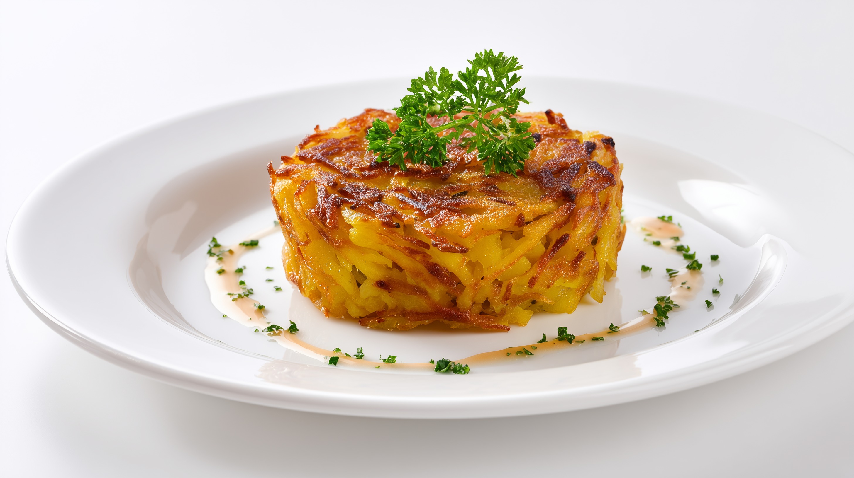 - Pfanne aus dem Ofen nehmen und die Rösti kurz ruhen lassen. Mit einem runden Ausstecher oder direkt aus der Pfanne in Portionen auf vorgewärmte weiße Teller anrichten. Mit frisch gehackter Petersilie garnieren und sofort servieren.