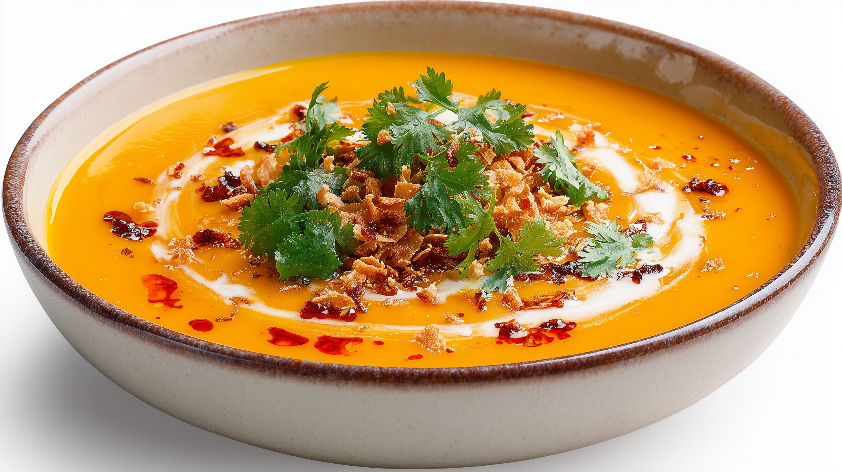 - Suppe auf vier Schüsseln verteilen. Jeweils einen Schuss Kokosmilch einwirbeln, geröstete Kokosraspeln und Chiliöl darüber träufeln und mit frischem Koriander garnieren.
