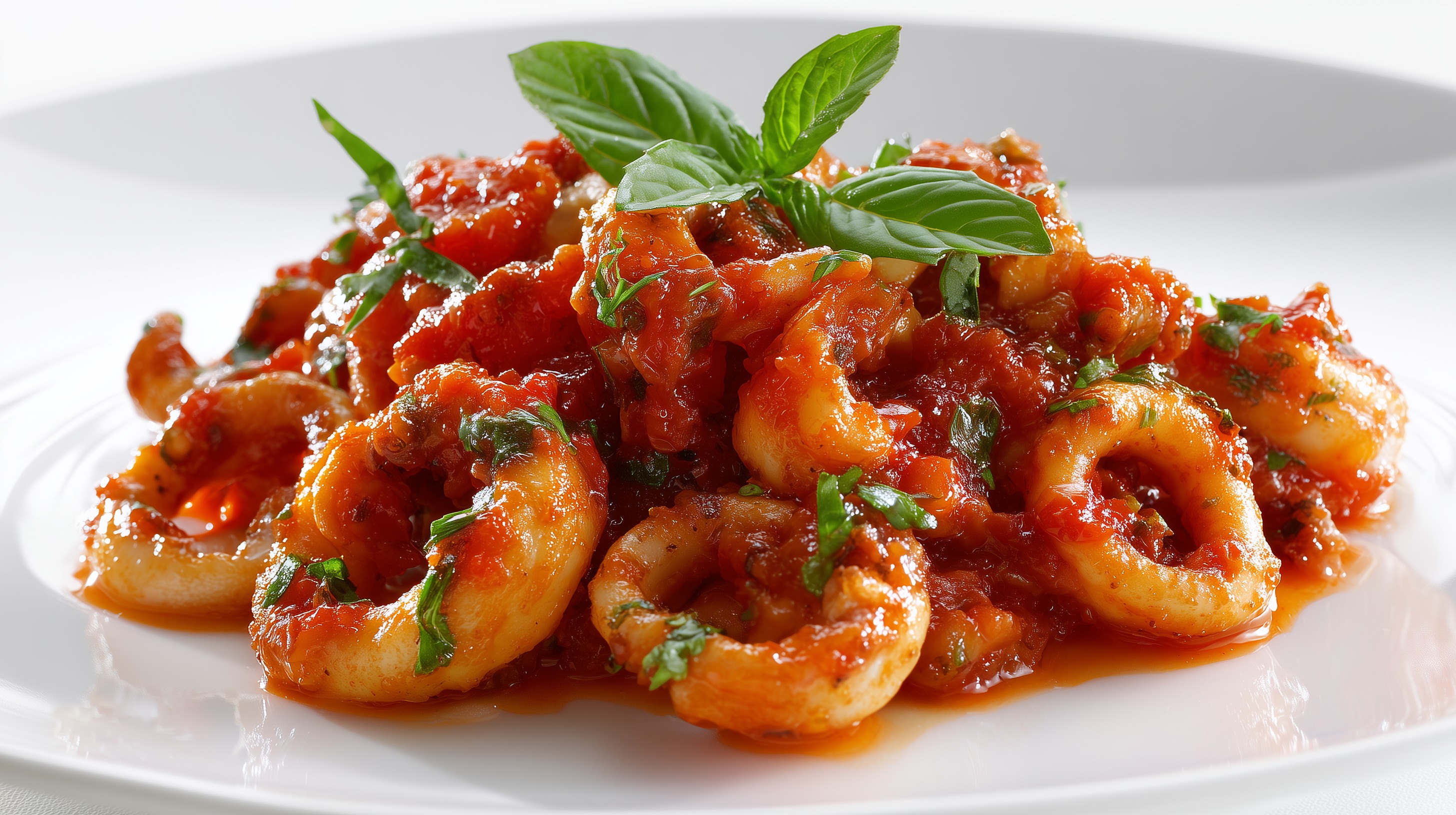 - Die Sauce mit Salz und Pfeffer würzen, die Hitze reduzieren und alles bei niedriger bis mittlerer Hitze ohne Deckel ca. 20–25 Minuten köcheln lassen, bis die Calamari zart sind und die Sauce sämig eingedickt ist. Gelegentlich umrühren.
