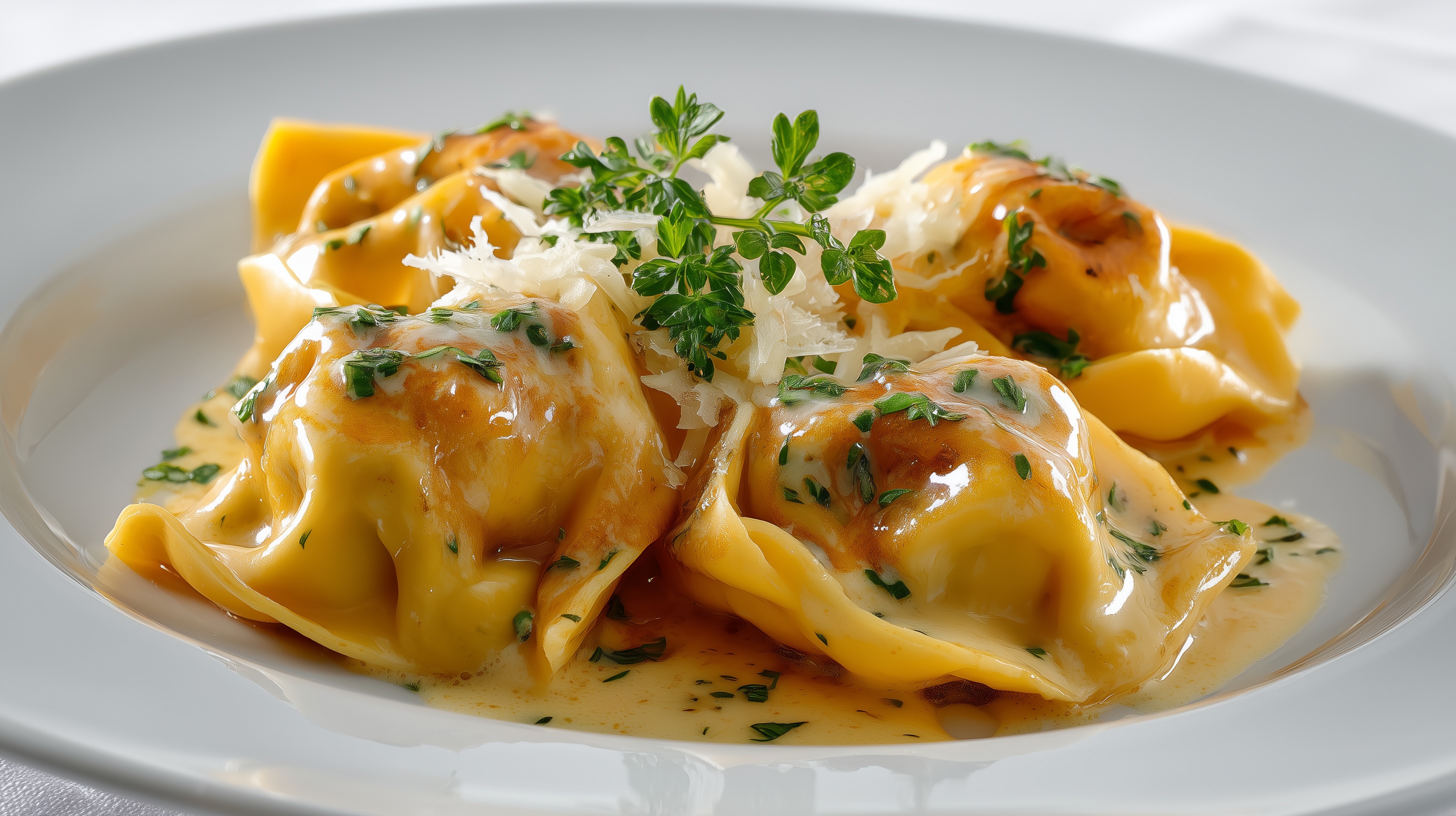 - Die Cappelletti auf vorgewärmten weißen Tellern anrichten, großzügig mit der Drei-Käsesauce übergießen und mit frisch geriebenem Parmesan, gehackter Petersilie und Thymianblättchen garnieren. Sofort servieren.
