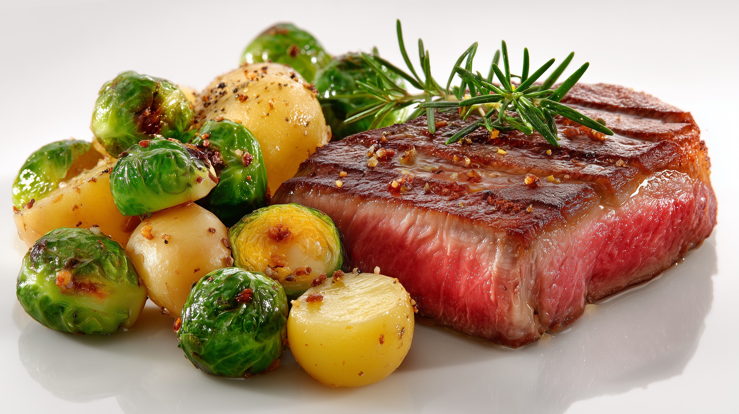 - Kartoffeln und Rosenkohl auf den Tellern anrichten, das Entrecôte danebenlegen und mit einem frischen Rosmarinzweig garnieren. Sofort servieren.