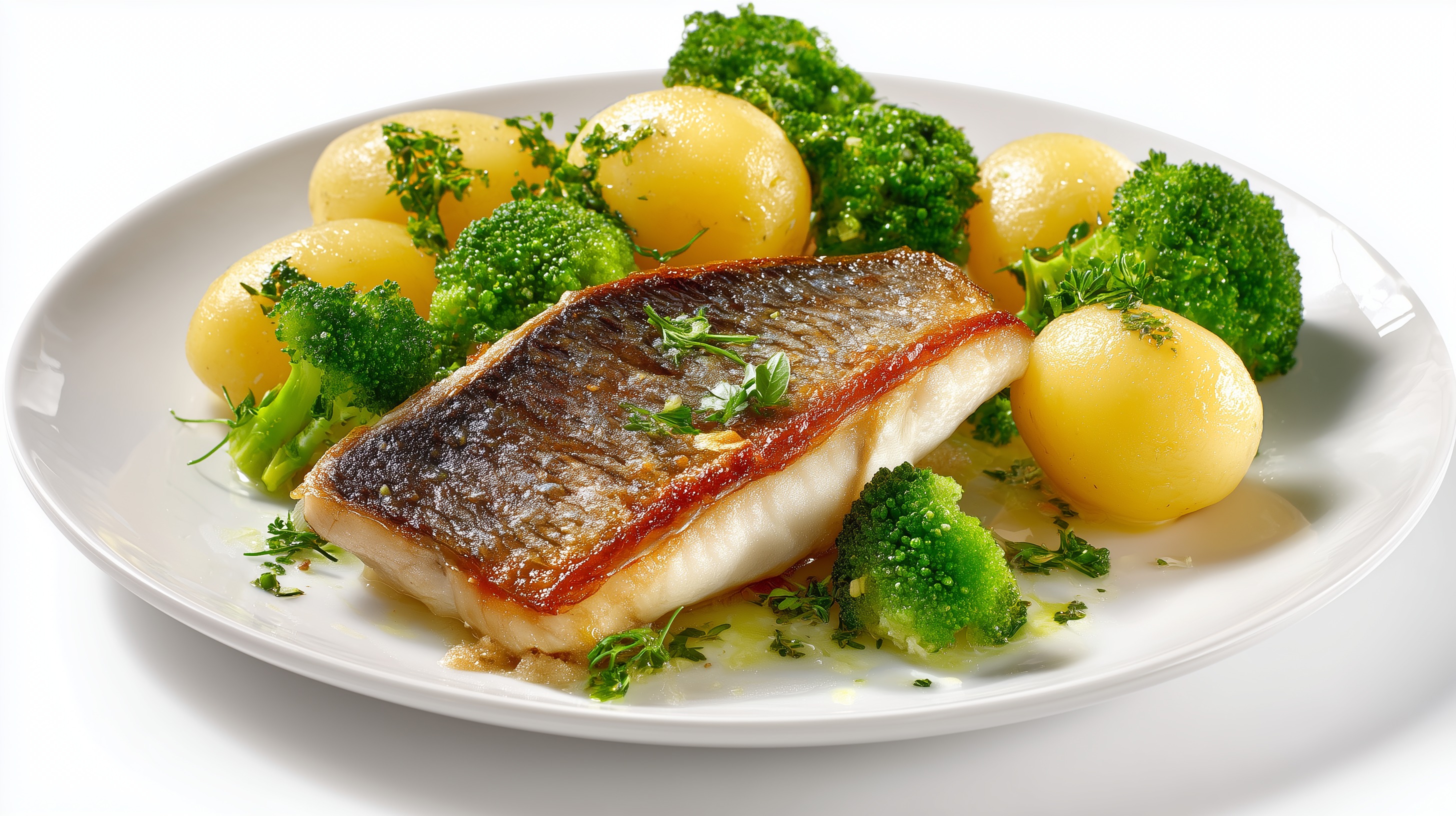 - Je ein Fischfilet (Hautseite nach oben) mit Kartoffeln und Brokkoli auf einem weißen Teller anrichten. Mit etwas Petersilie und einem Spritzer Olivenöl garnieren und sofort servieren.