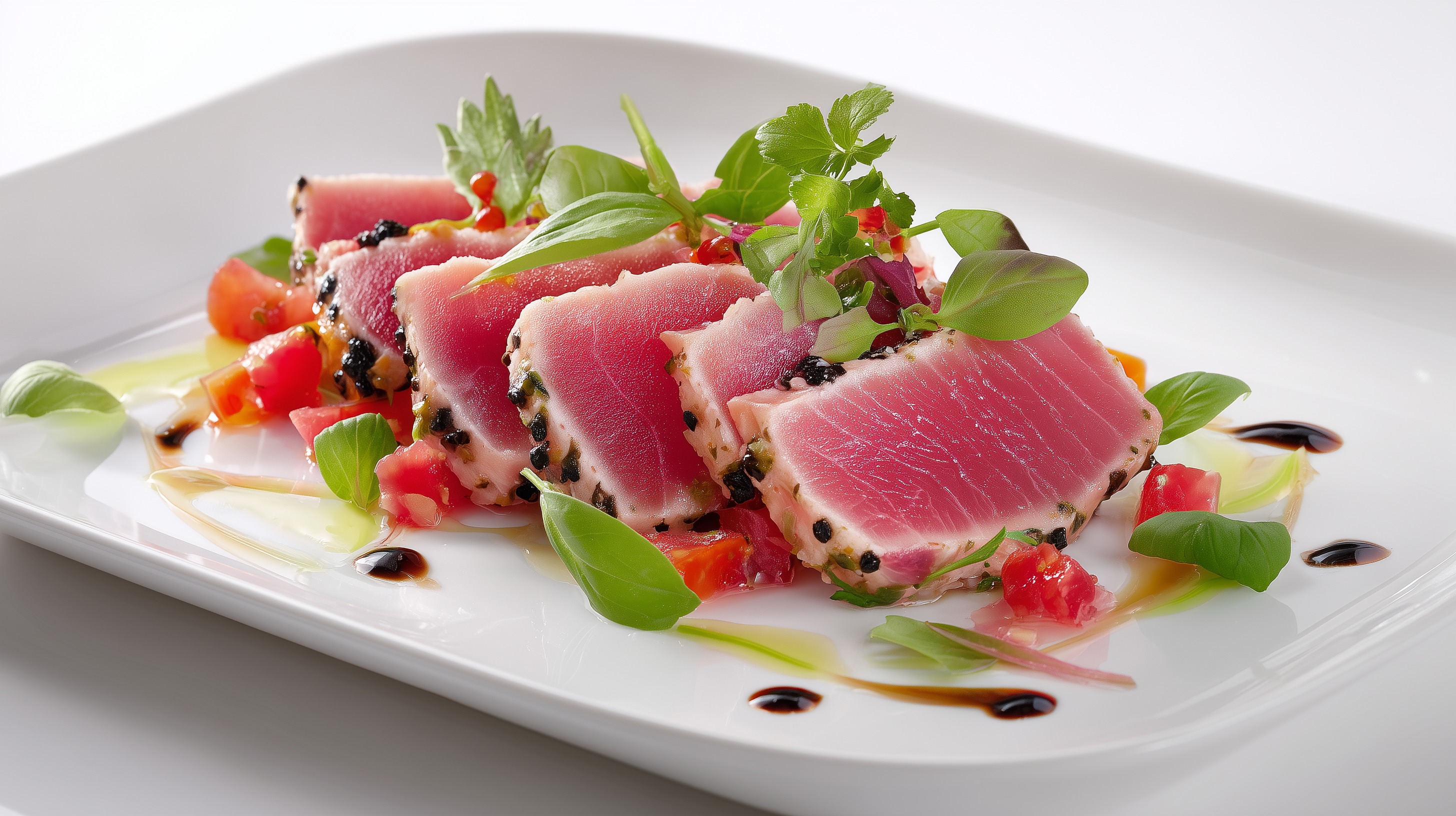 - Anrichten: Je 2 EL Tomaten-Salsa auf einem weißen Teller verteilen. Die Thunfischscheiben leicht überlappend darauf anrichten. Kräuter und Microgreens großzügig darüber drapieren.
