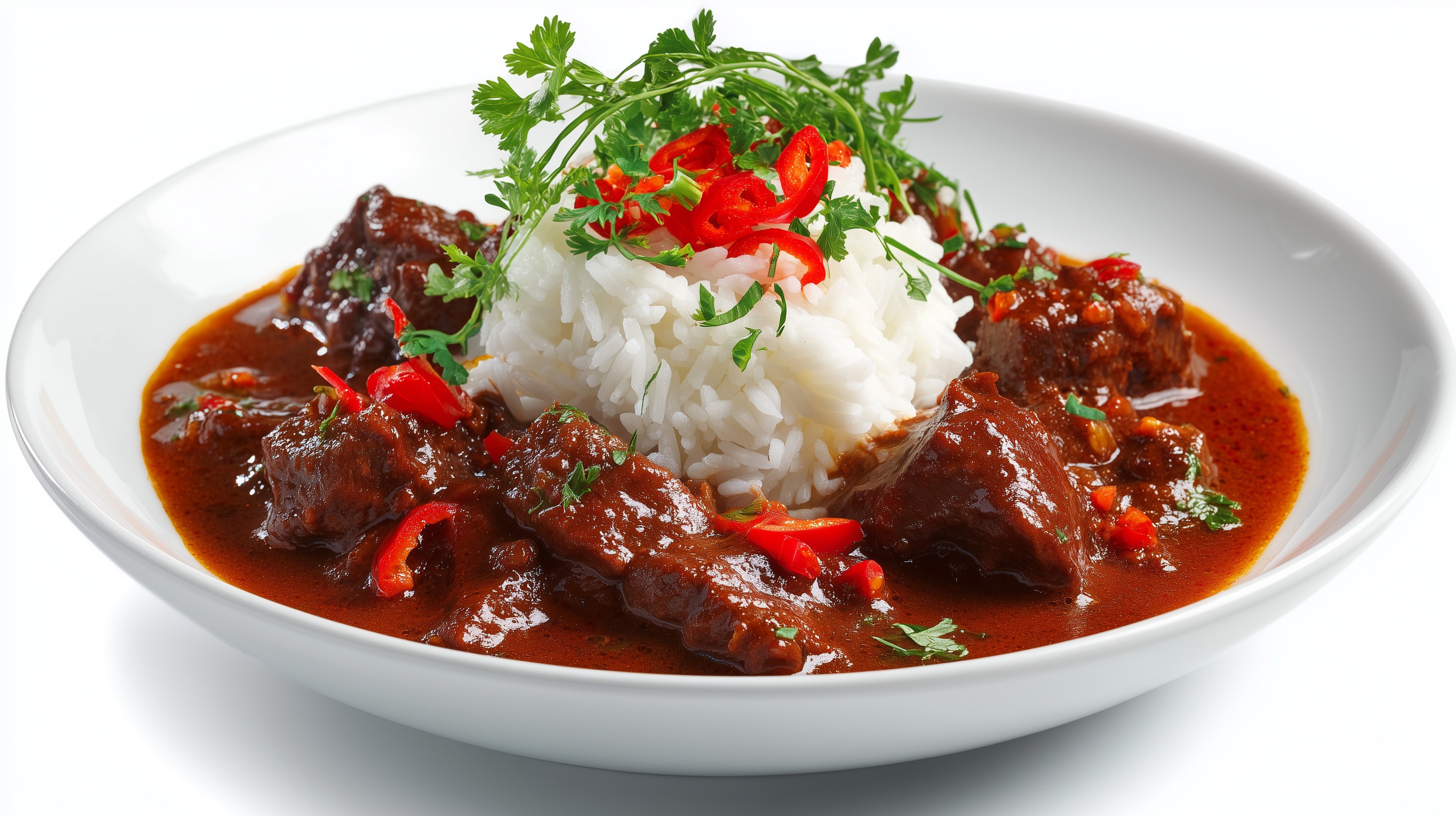 - Den Reis mithilfe einer Schüssel oder eines Förmchens in die Mitte von tiefen Tellern stürzen. Das Curry-Gulasch ringsherum anrichten. Mit frischen Chiliringen und reichlich gehackter Petersilie garnieren und sofort servieren.