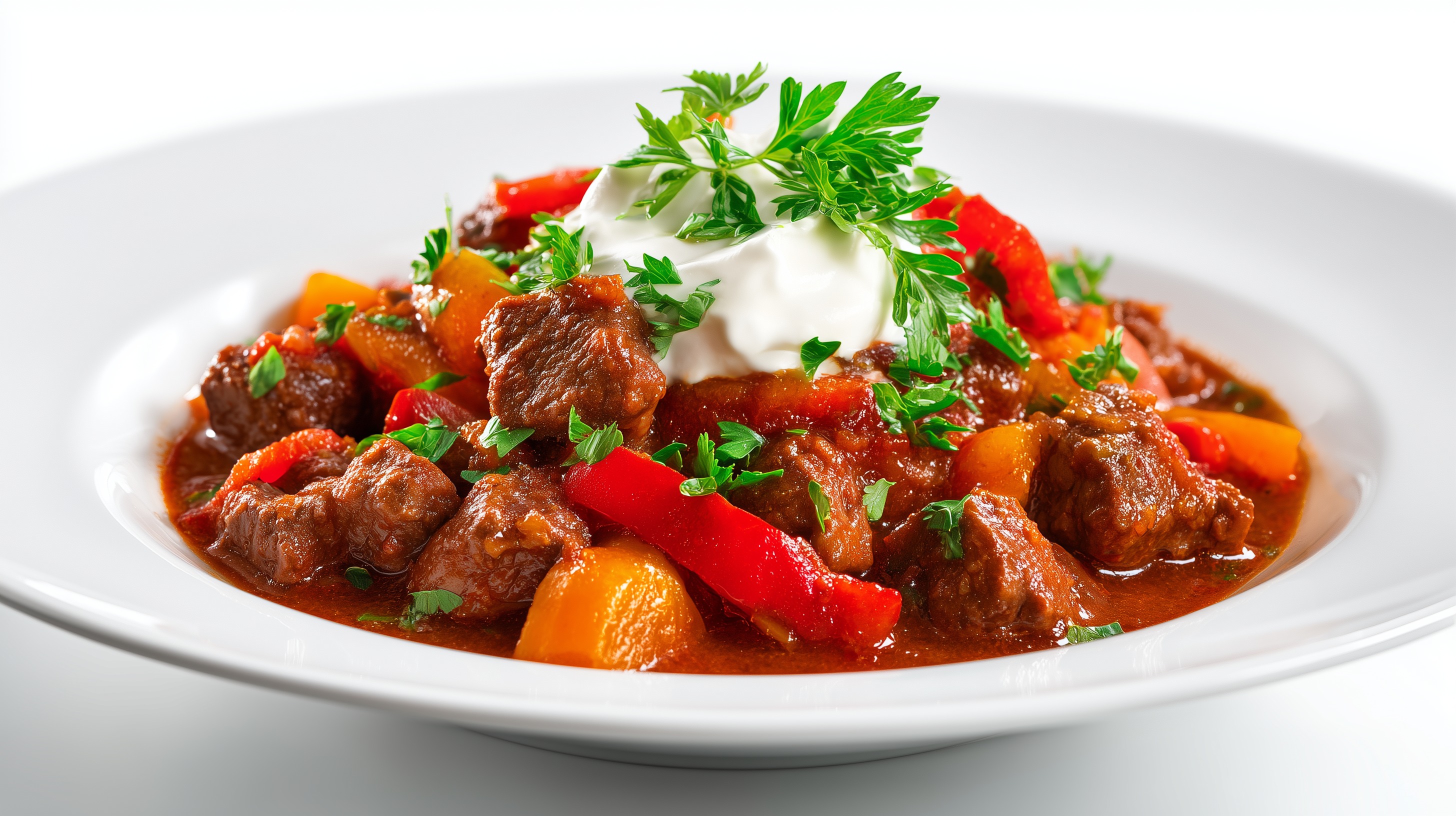 - Das Gulasch nochmals mit Salz, Pfeffer und Paprikapulver abschmecken. In tiefen Tellern anrichten, einen großzügigen Löffel Sauerrahm in die Mitte setzen und mit frisch gehackter Petersilie garnieren. Nach Belieben mit Brot, Reis oder Nudeln servieren.
