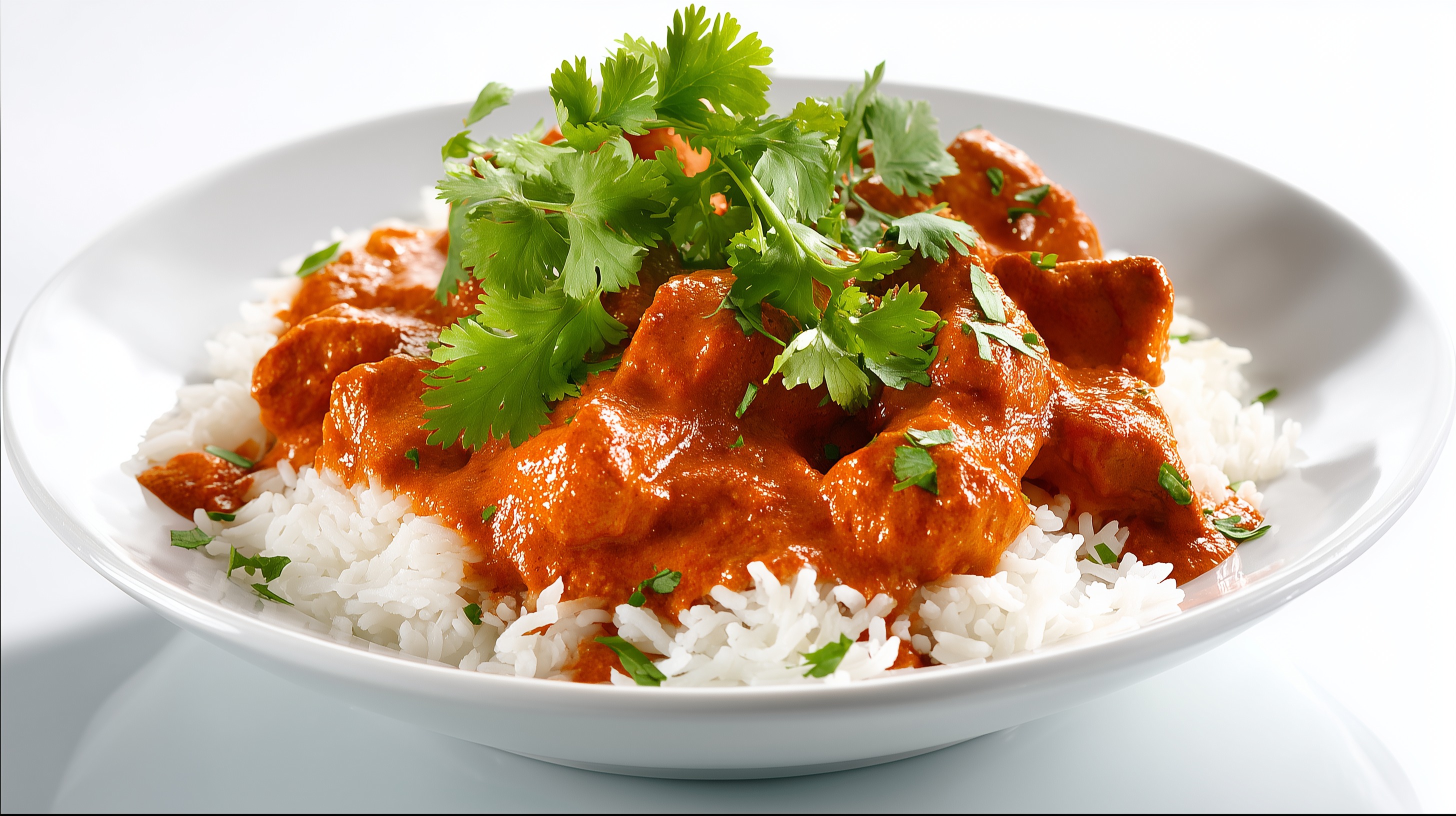 - Den Reis auf vier Teller oder tiefe Schüsseln verteilen, das Curry darübergeben und großzügig mit frischem Koriander bestreuen. Sofort servieren.