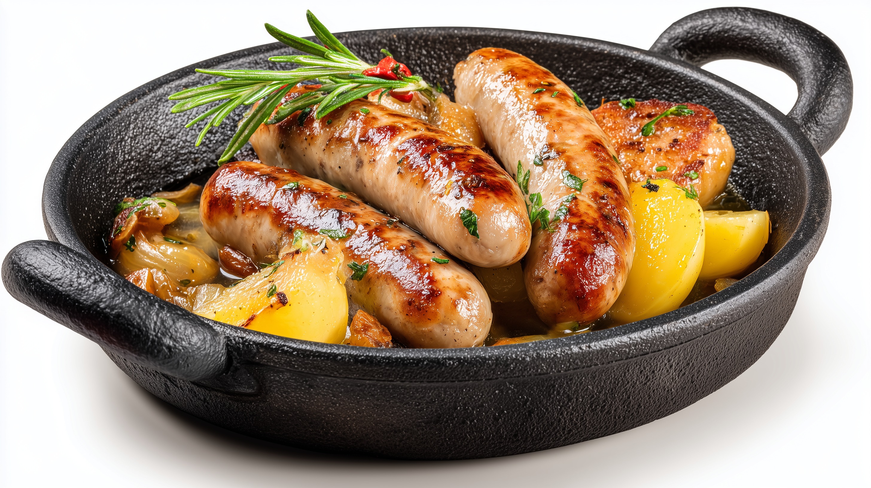 Tipp: Für noch mehr Röstaroma die fertige Pfanne für 5–8 Minuten unter den vorgeheizten Backofengrill (200 °C Oberhitze) schieben – so bekommen die Bratwürste eine besonders knusprige Kruste. Wer mag, kann auch einen Schuss Weißwein statt eines Teils der Brühe verwenden, das gibt dem Gericht eine feine Tiefe.