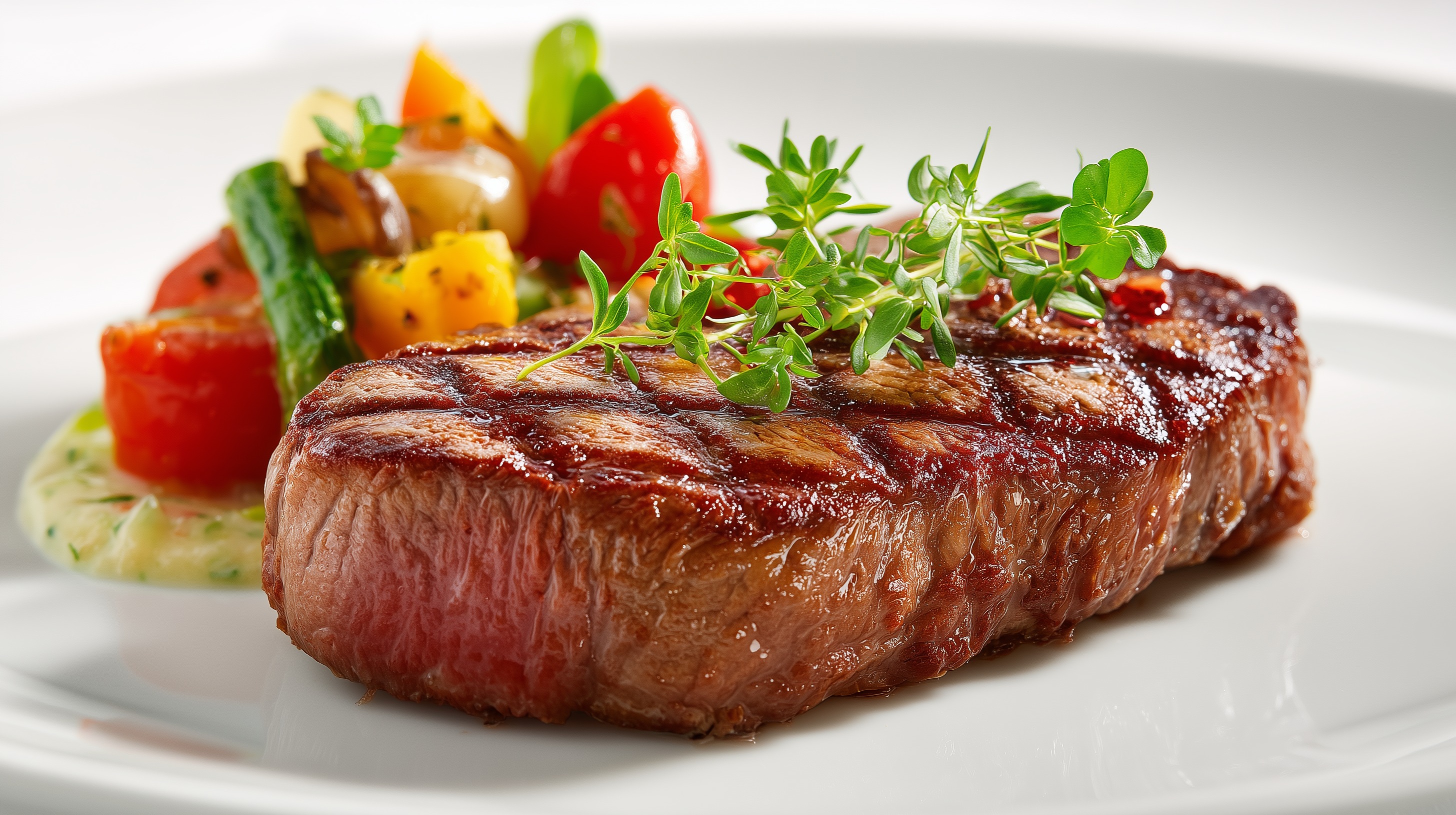 - Je einen tiefen weißen Teller mit dem bunten Kaisergemüse anrichten. Das Entrecôte-Steak daneben oder darauf platzieren. Mit einem Teelöffel Kräuterbutter toppen und mit frischen Thymianzweigen garnieren. Sofort servieren.