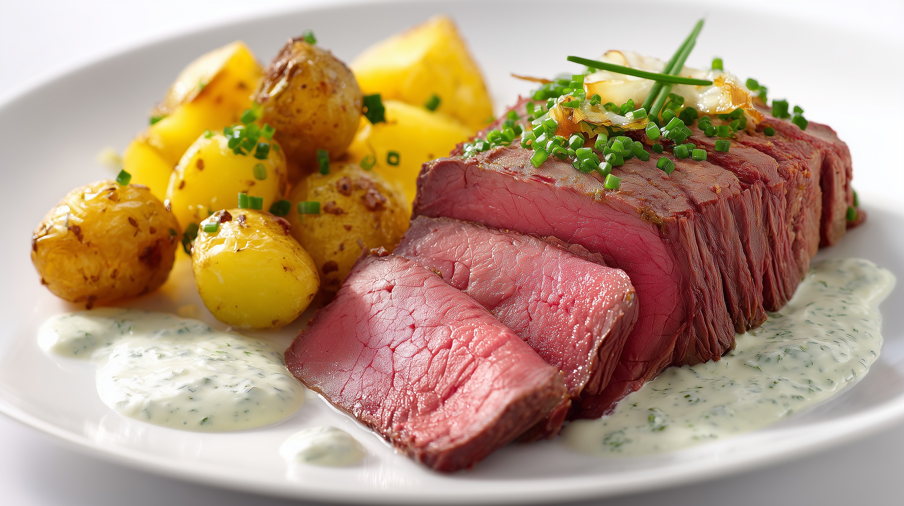 - Den Tafelspitz quer zur Faser in gleichmäßige Scheiben schneiden. Auf vorgewärmten Tellern mit der Meerrettichsoße und den Bratkartoffeln anrichten. Nach Belieben mit zusätzlichem Schnittlauch garnieren.