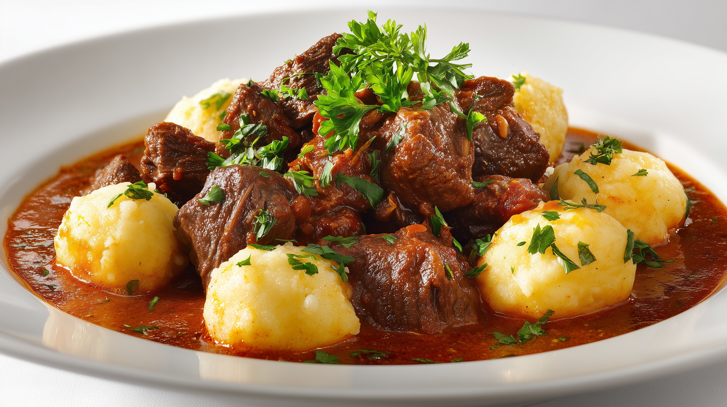 - Anrichten: Klöße mit einer Schaumkelle herausnehmen. Gulasch mit den Kartoffelklößen in tiefen Tellern anrichten und großzügig mit frischer Petersilie bestreuen.