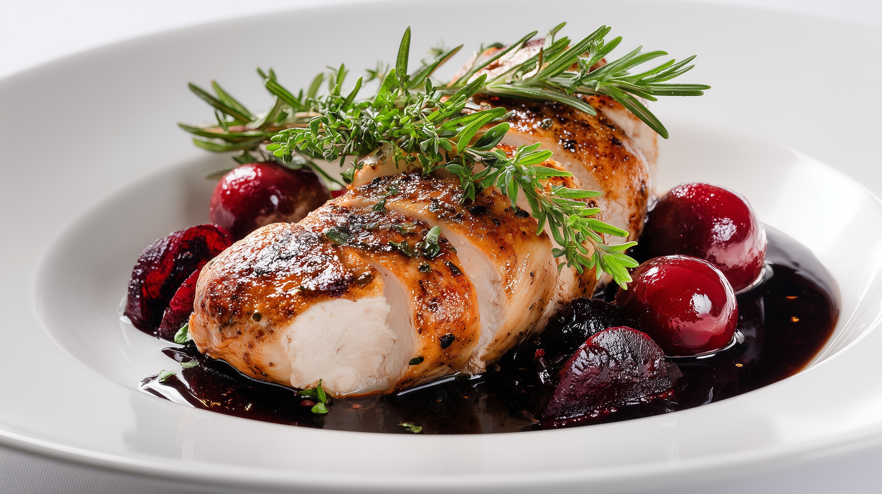 - Zum Anrichten etwas Rotweinjus auf den Boden des Tellers geben. Die Poulardenbrust leicht aufschneiden oder ganz daraufsetzen, die Kirschen ringsherum verteilen und mit frischem Rosmarin und Thymian garnieren.