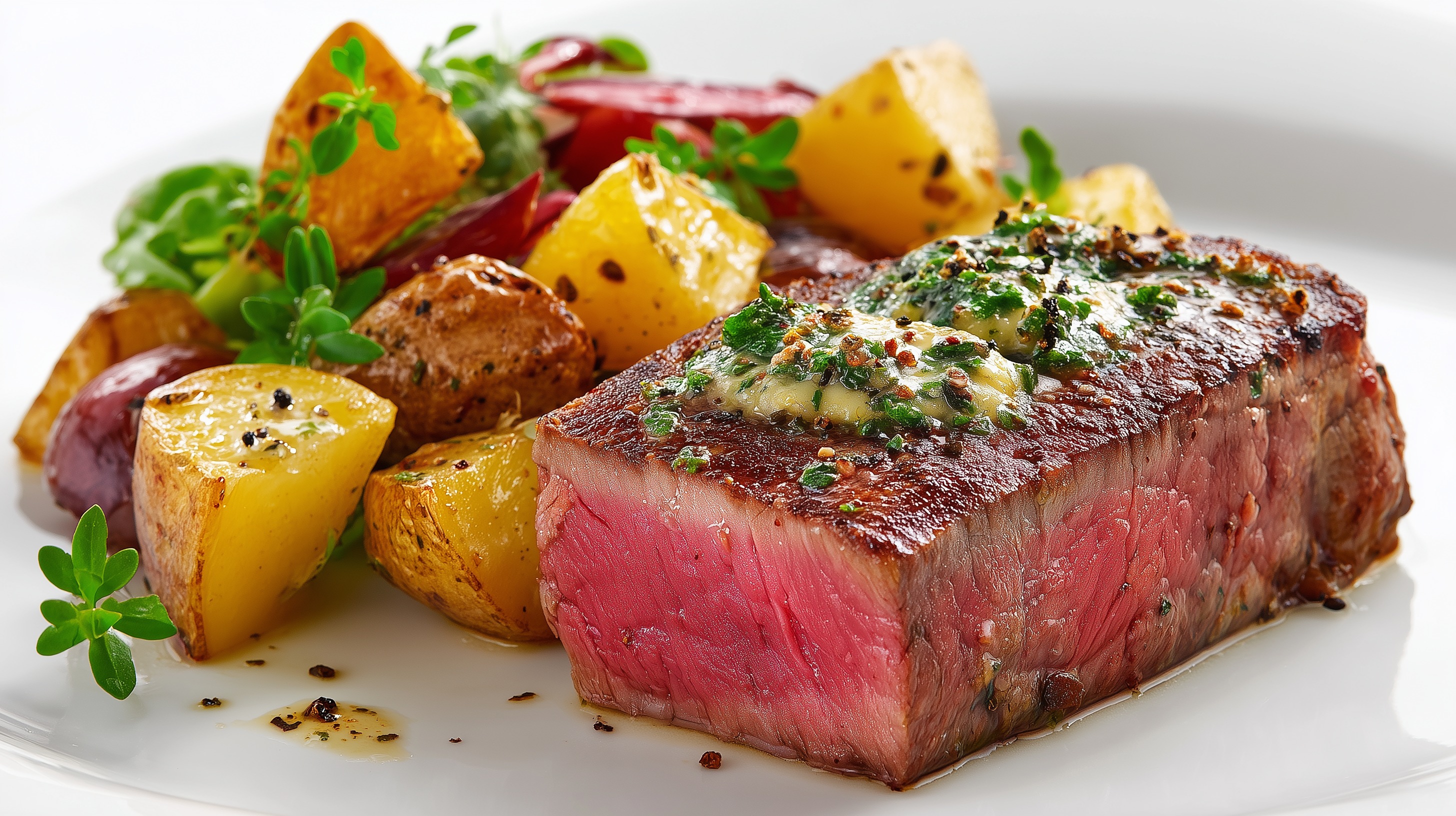 - Anrichten: Die Rumpsteaks auf vorgewärmten Tellern zusammen mit den gerösteten Kartoffeln anrichten. Mit frischen Kräutern garnieren und sofort servieren.