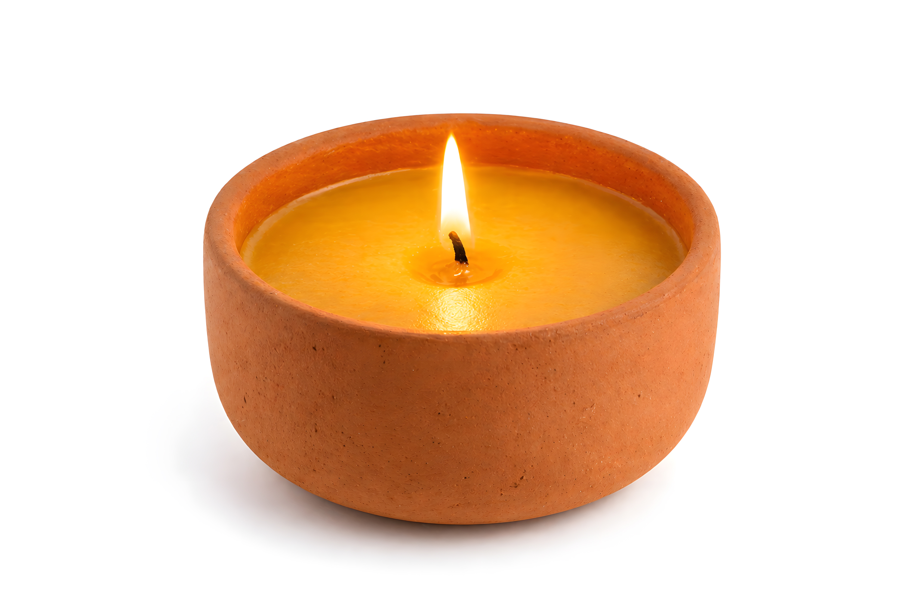 Dieses hochwertige Produktfoto zeigt eine brennende Kerze in einer runden, handgefertigten Terrakotta-Schale. Das gelbe Wachs ist vollständig eingeschmolzen und füllt die Schale fast bis zum Rand. Im Zentrum brennt eine kleine, aufrechte Flamme an einem leicht angekohlten Docht und wirft ein warmes, goldenes Licht auf die gesamte Oberfläche.