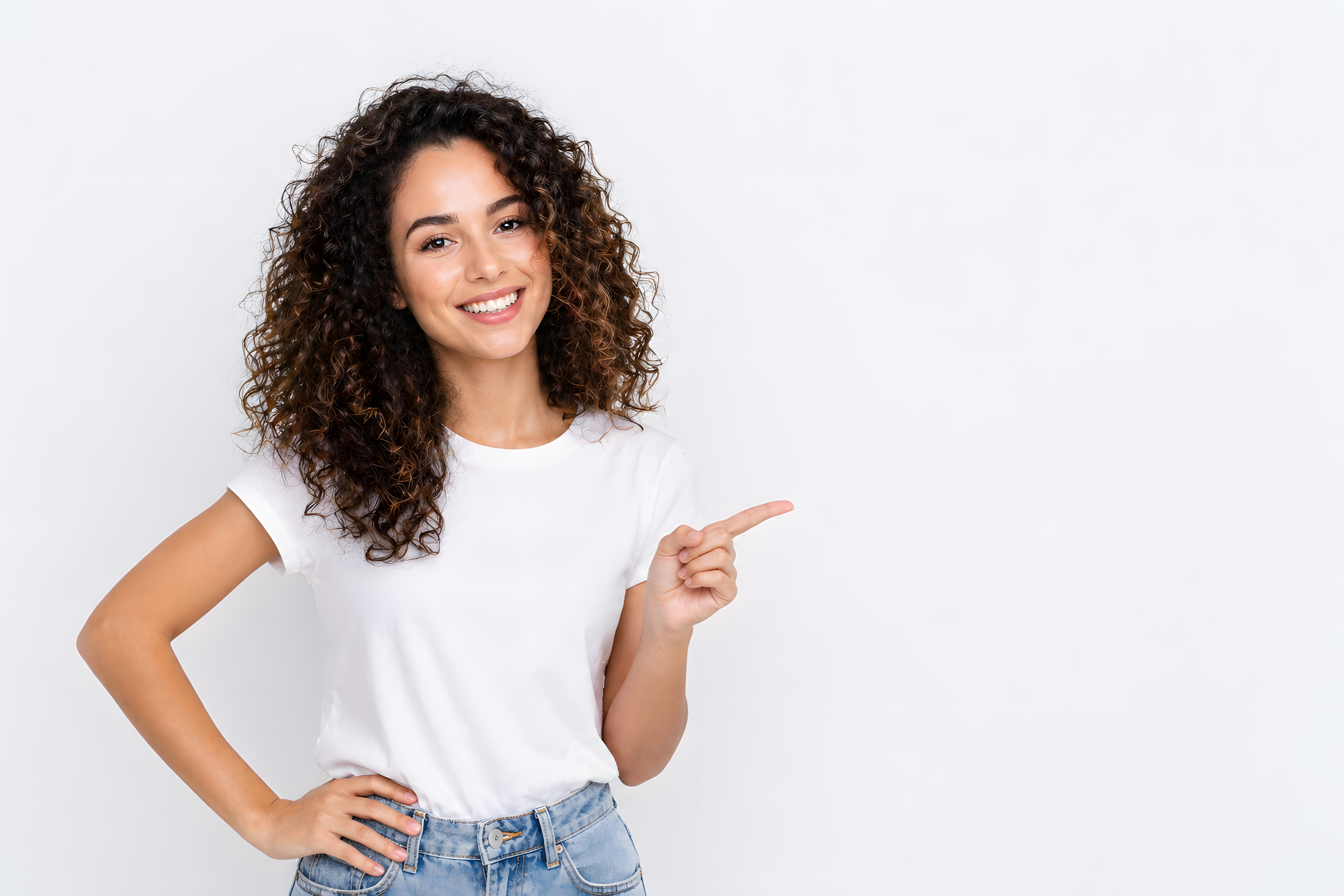 Diese Studioaufnahme zeigt eine junge Frau mit langen, brünetten Locken, die fröhlich in die Kamera lächelt. Sie trägt ein schlichtes weißes T-Shirt und eine hellblaue Jeans. Ihre linke Hand ruht selbstbewusst auf der Hüfte, während sie mit dem rechten Zeigefinger nach rechts deutet – in Richtung des großzügigen Textfreiraumbereichs im Bild.