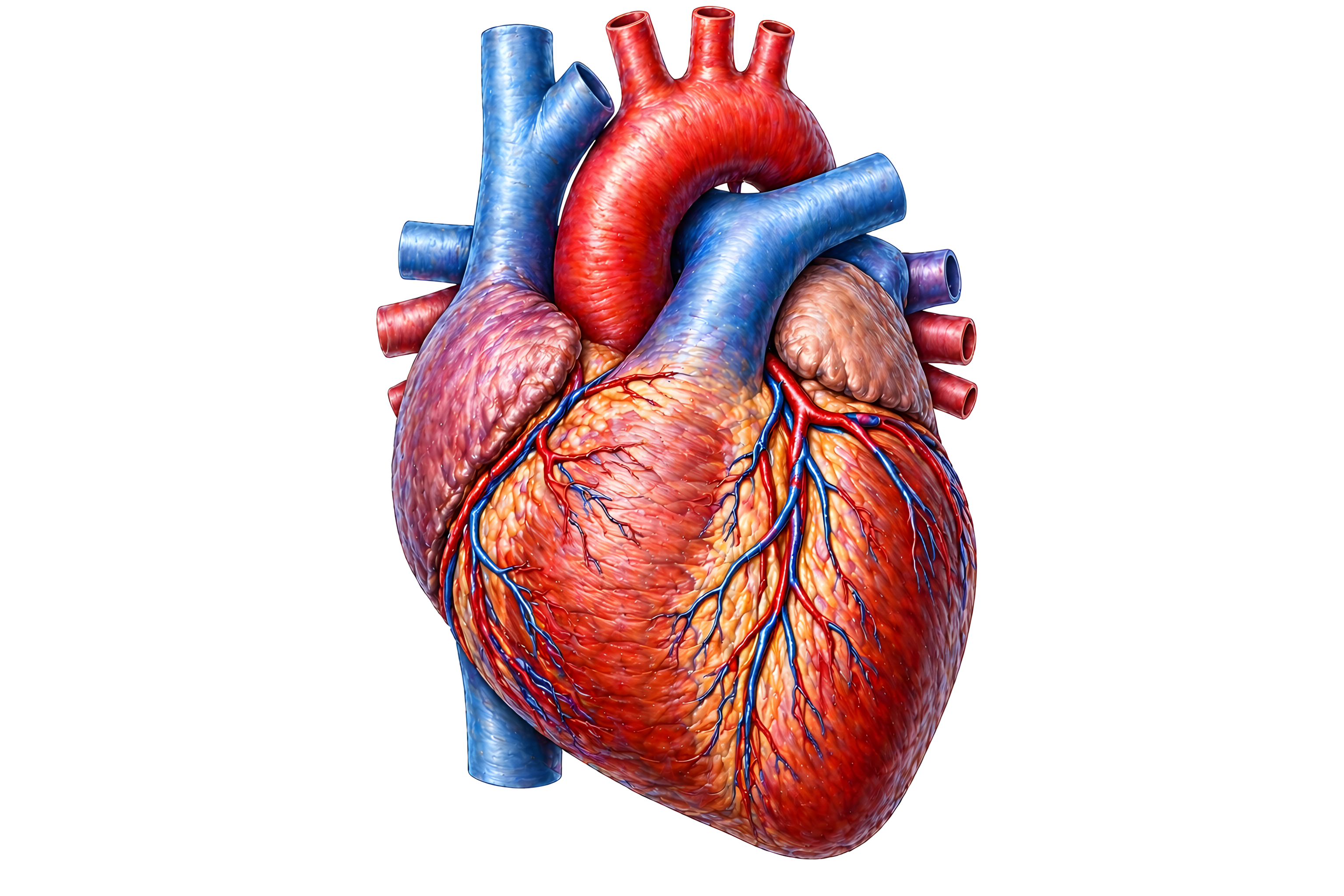 Diese detailreiche anatomische Illustration zeigt ein menschliches Herz in einer dreidimensionalen, realistischen Darstellung. Das Organ ist von vorne leicht seitlich perspektivisch abgebildet und hebt die wichtigsten Strukturen klar hervor. Die leuchtend roten Bereiche repräsentieren sauerstoffreiches Blut führende Gefäße wie die Aorta, während die blau gefärbten Strukturen die Venen und sauerstoffarmes Blut symbolisieren. Auf der Oberfläche des Herzmuskels sind fein verzweigte Koronargefäße sichtbar, die in rot und blau gehalten sind und die Durchblutung des Herzmuskels verdeutlichen.