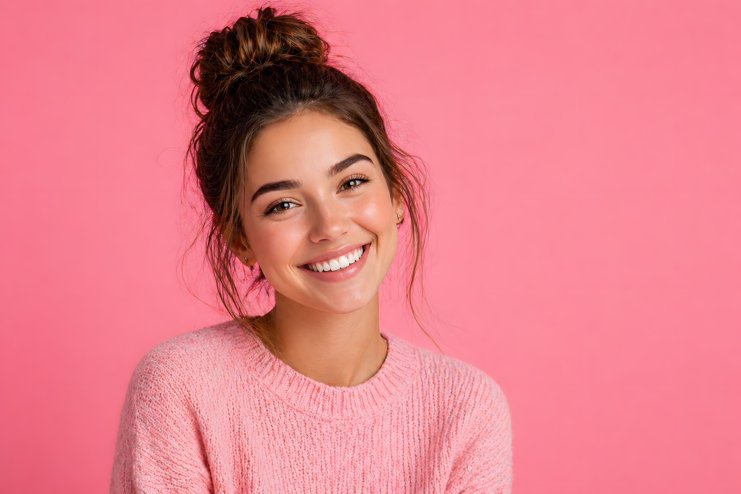 Dieses hochwertige Portraitfoto zeigt eine junge Frau mit einem strahlenden Lächeln vor einem gleichmäßig ausgeleuchtetem rosafarbenen Studiohintergrund. Ihr dunkelbraunes Haar ist locker zu einem Dutt hochgesteckt, mit einzelnen herausfallenden Strähnen, die dem Look eine natürliche und ungezwungene Leichtigkeit verleihen.