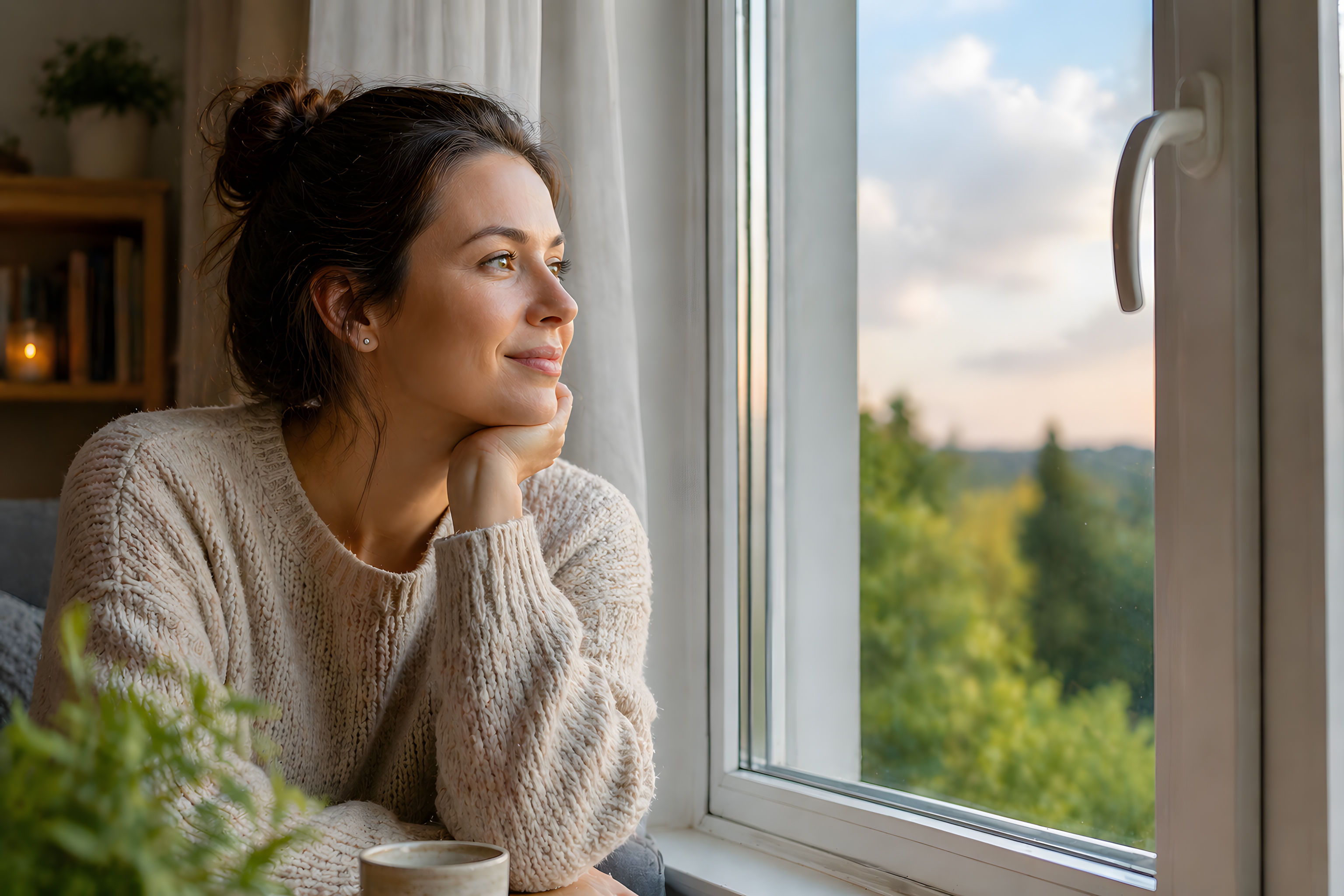 Diese stimmungsvolle Aufnahme zeigt eine junge Frau mit dunklem, hochgestecktem Haar, die entspannt an einem großen Fenster sitzt und gedankenverloren in die grüne Landschaft schaut. Sie trägt einen kuscheligen beigefarbenen Strickpullover und stützt ihr Kinn nachdenklich auf die Hand. Vor ihr steht eine Tasse, vermutlich Kaffee oder Tee. Das warme, weiche Licht der Szene erzeugt eine ruhige, intime Atmosphäre.