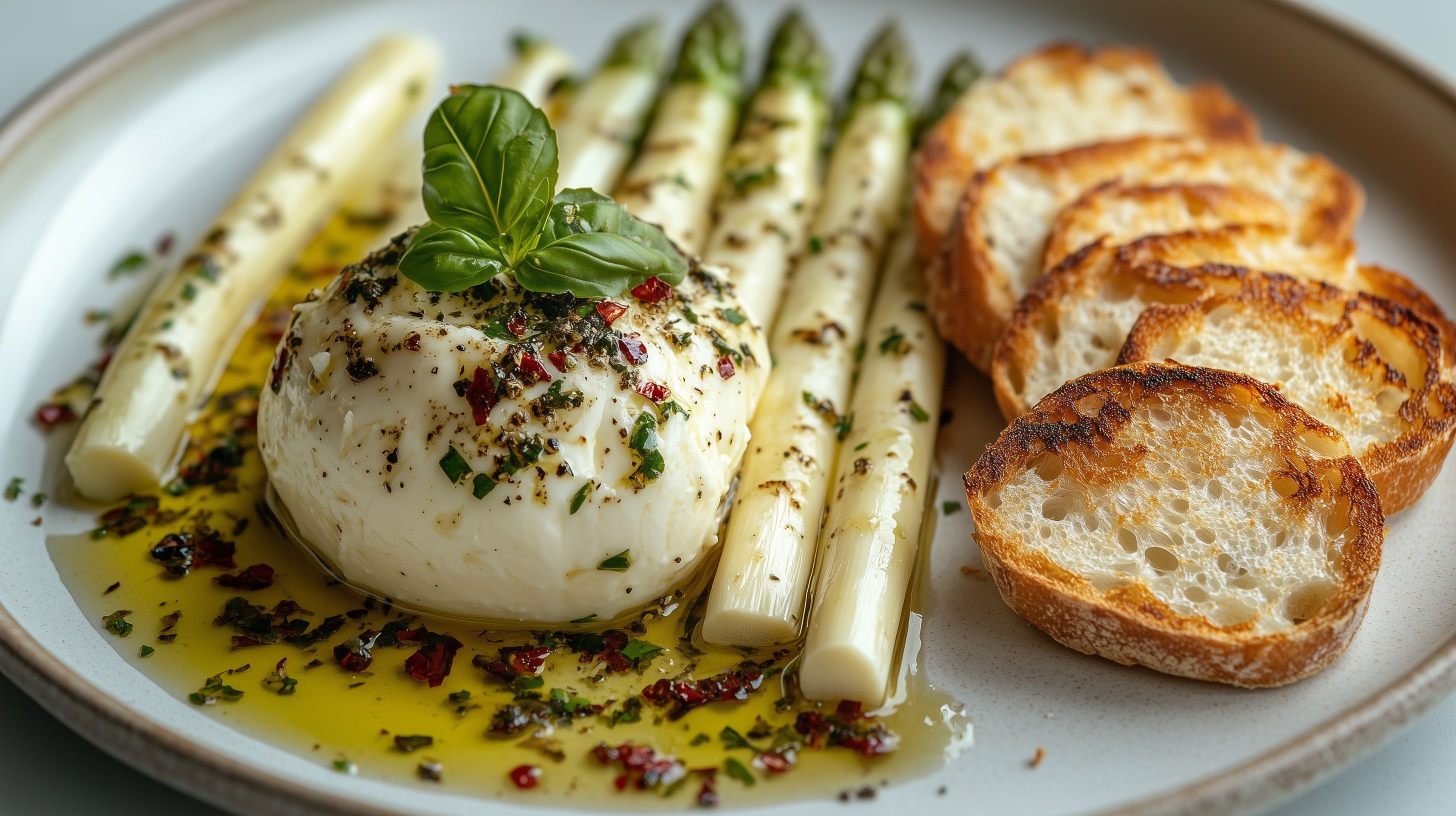 Dieses appetitanregende Foto zeigt ein köstliches Gericht aus der mediterranen Küche: Eine cremige Burrata-Kugel liegt inmitten von knusprigem, geröstetem Brot und gegrilltem, weißem Spargel. Die Zutaten sind liebevoll angerichtet und mit frischen Kräutern und feinen Gewürzen akzentuiert. Das Arrangement besticht durch seine natürliche Optik und die sorgfältige Komposition. Dieses hochwertige Stockfoto in hoher Auflösung eignet sich perfekt für die Verwendung in Blogs, Newslettern, Social-Media-Beiträgen oder Werbematerialien rund um das Thema gesunde, italienische Küche. Das Bild steht unter einer kostenlosen Creative-Commons-Lizenz zur Verfügung.