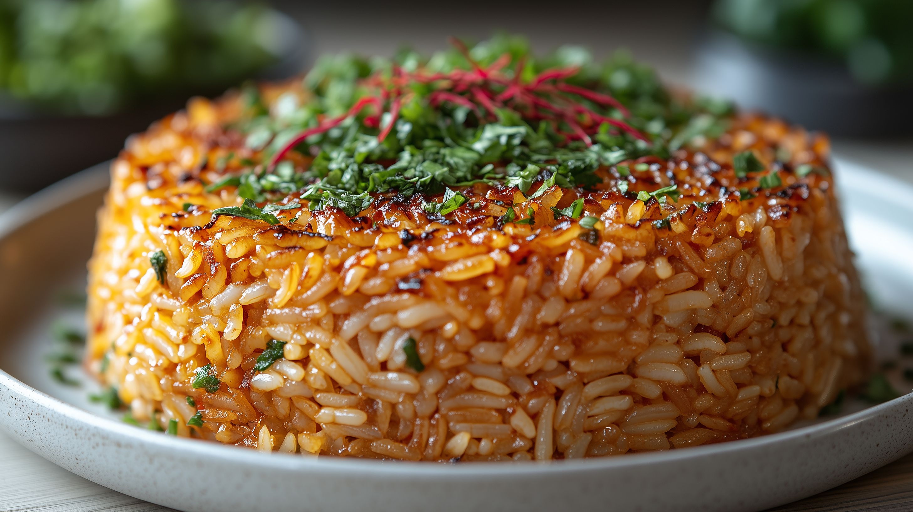 Das Foto zeigt einen aromatischen, persischen Reis mit einer knusprigen, goldbraunen Kruste, der mit frischen Kräutern wie Minze und Koriander garniert ist. Der Reis ist in einer rustikalen Schüssel angerichtet und sieht sehr appetitlich aus. Die kräftigen Farben - Orange, Rot und Grün - verleihen dem Gericht einen authentischen, orientalischen Charakter. Dieses Stockfoto eignet sich perfekt für Kochbücher, Rezeptblogs, Social-Media-Beiträge oder Werbematerialien zur persischen bzw. iranischen Küche. Das Bild ist in hoher Auflösung verfügbar und kann unter einer Creative-Commons-Lizenz kostenlos genutzt werden.