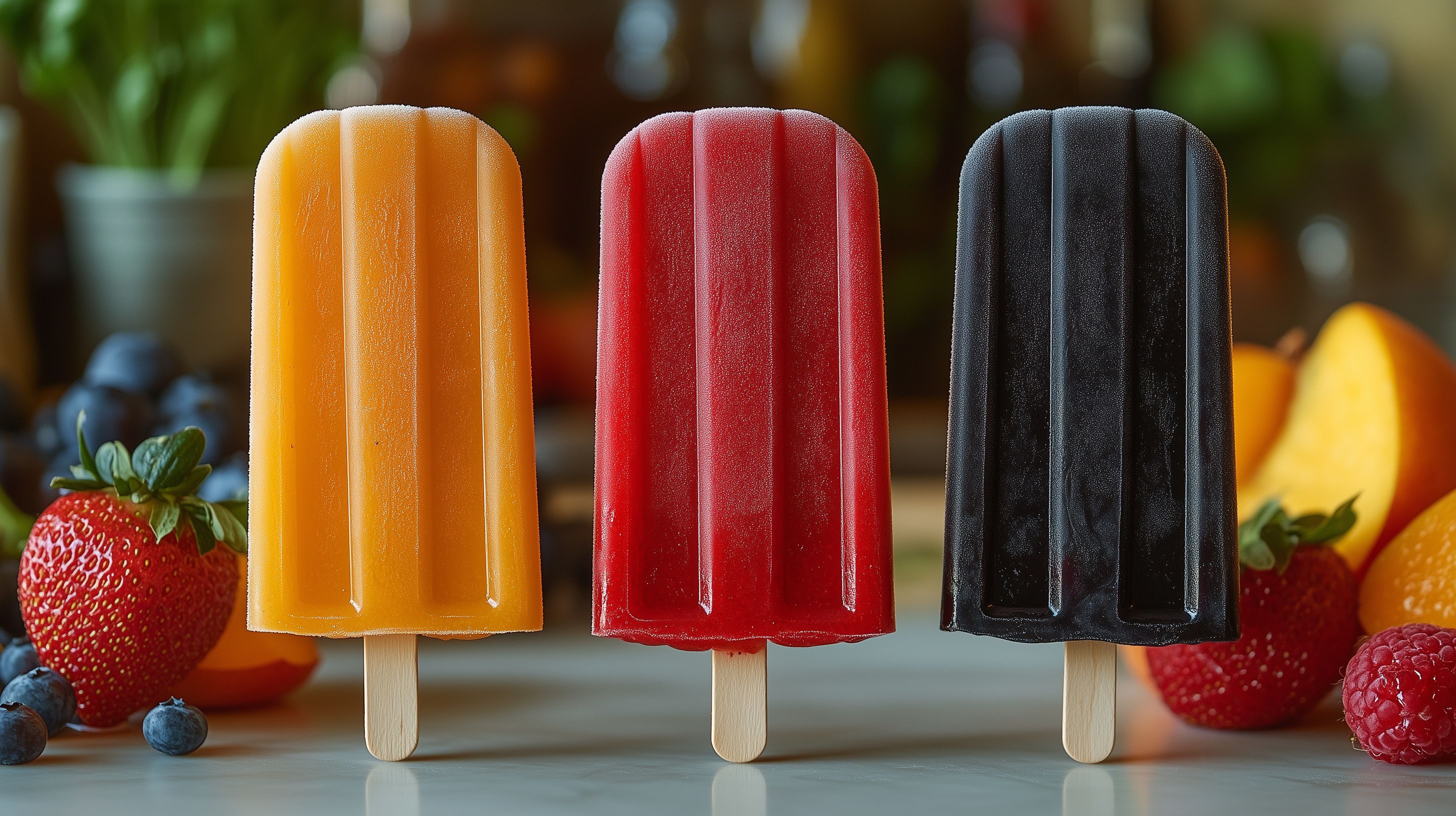 Dieses farbenfrohe Foto zeigt drei verschiedenfarbige Eislutscher auf Holz-Sticks - in den Farben Rot, Schwarz und Orange. Die Eislutscher sind umgeben von frischen Erdbeeren, Himbeeren und Heidelbeeren, die eine geschmackvolle Ergänzung zum Eis bilden. Die Komposition und die Schärfentiefe des Bildes lenken den Blick gezielt auf die köstlichen Eiskreationen. Dieses hochauflösende Stockfoto eignet sich hervorragend für den Einsatz in Blogs, Newslettern, Social-Media-Posts oder Werbematerial rund um Sommer, Erfrischungen und Süßigkeiten. Es steht unter einer Creative-Commons-Lizenz und kann somit kostenlos genutzt werden.