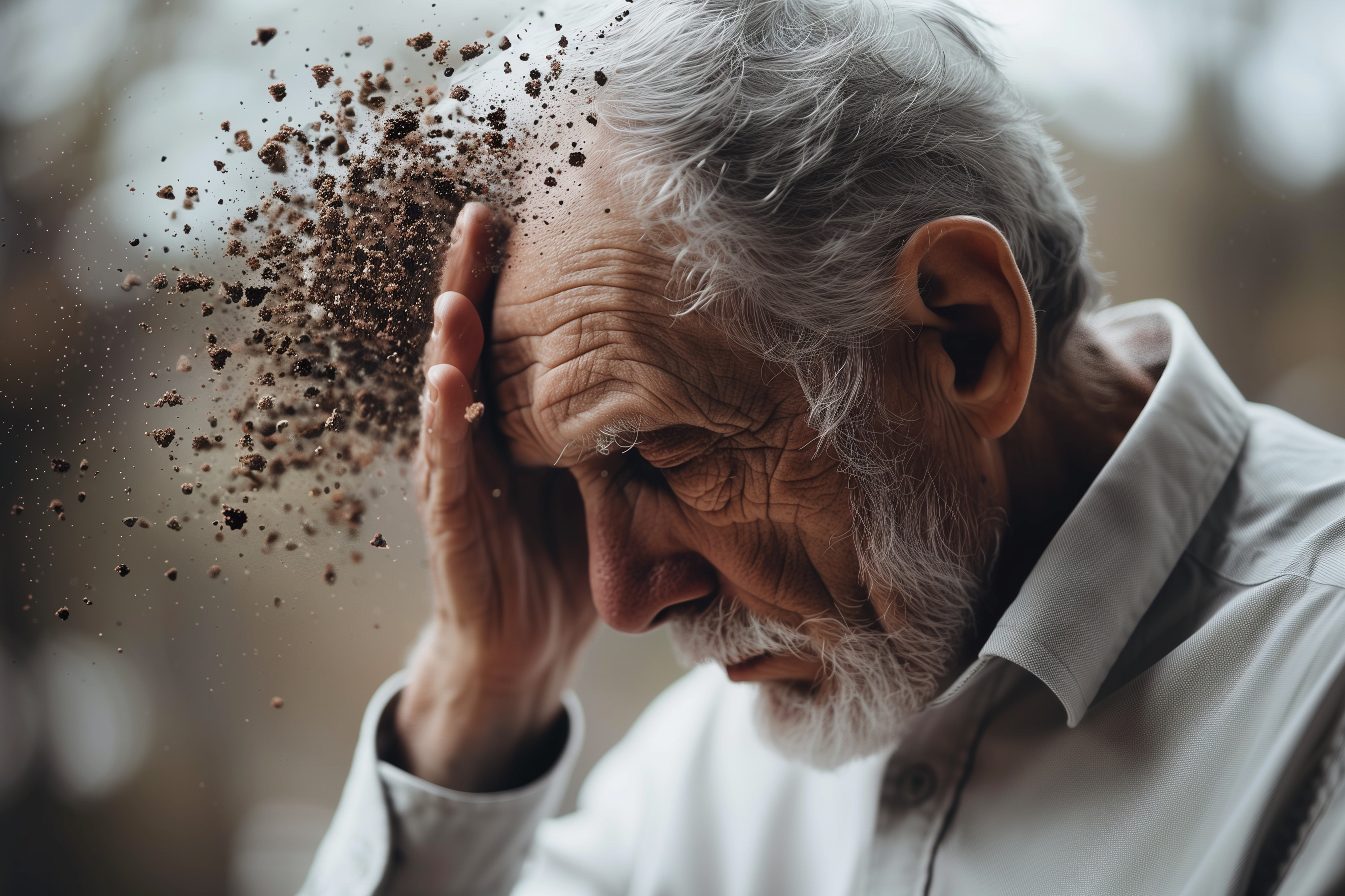 Das Foto zeigt das Gesicht eines älteren Mannes mit grauen Haaren. Sein Gesichtsausdruck ist von Konzentration und Schwermut geprägt. Feinste Staubpartikel scheinen aus seinem Gesicht auszudringen, was das Gefühl von Alterung und Vergänglichkeit unterstreicht. Das Bild ist in gedämpften Farbtönen gehalten und vermittelt eine nachdenkliche, melancholische Stimmung.