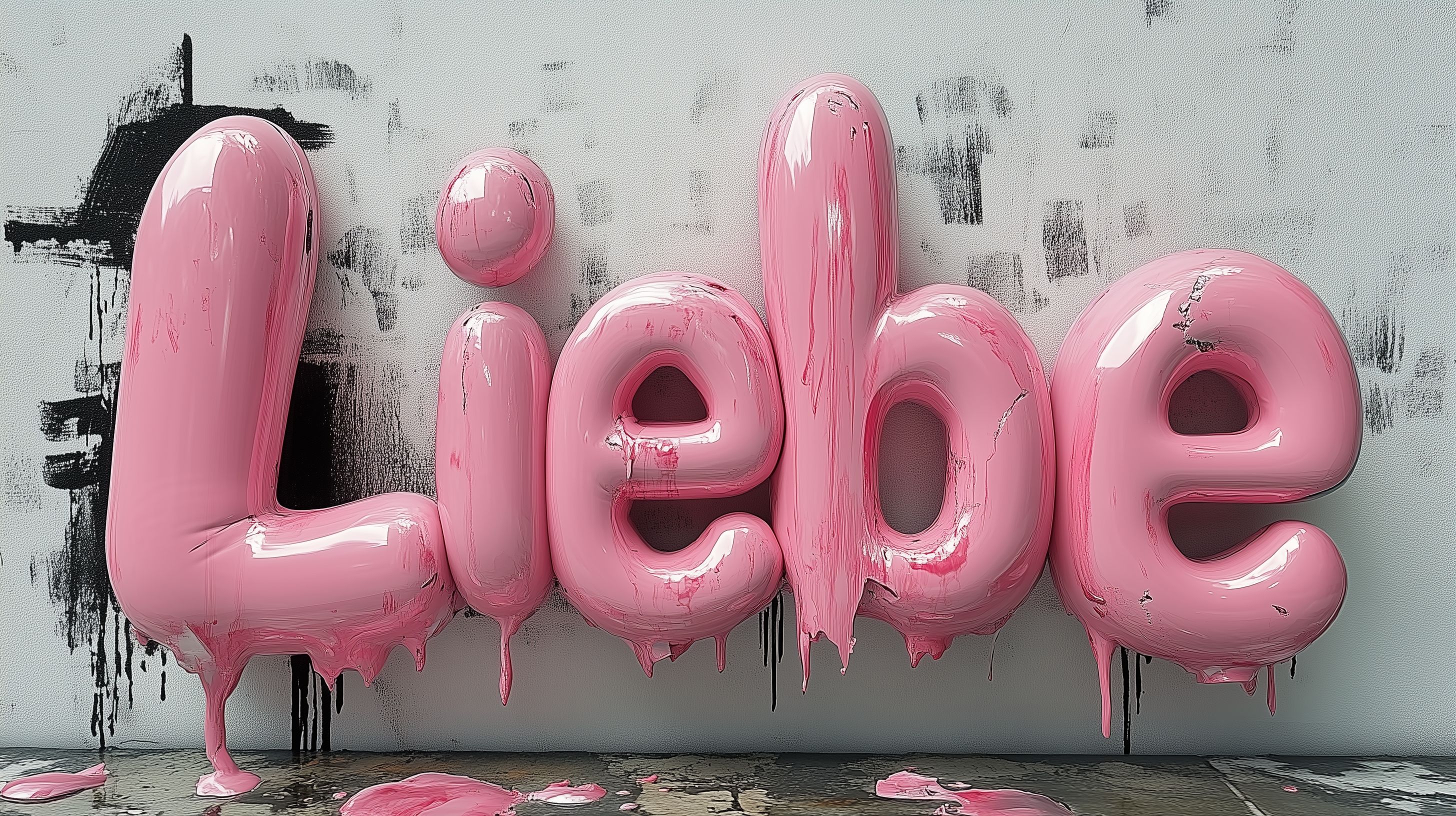 Dieses Foto zeigt ein dekoratives Arrangement aus rosafarbenen Ballons in Form des Wortes 'Liebe'. Die Buchstaben haben eine dreidimensionale, glänzende Oberfläche, die den Eindruck erweckt, als würden sie in der Luft schweben. Der weiße Hintergrund lässt die Ballons besonders hervortreten und verleiht der Szene einen minimalistischen, abstrakten Charakter.