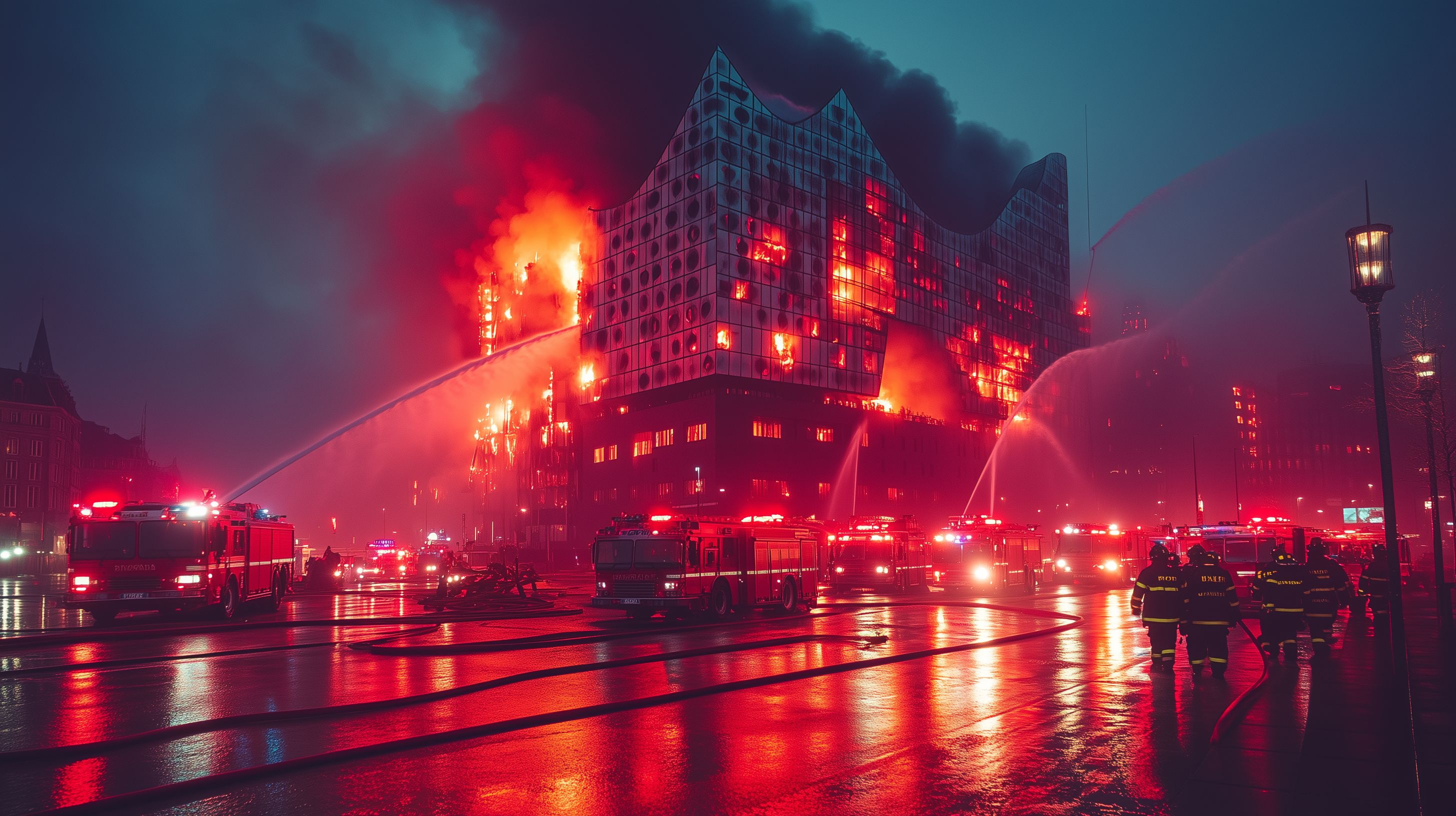 Das Bild zeigt eine dramatische Nachtszene in Hamburg: Die Elbphilharmonie brennt lichterloh, während Feuerwehrleute versuchen, die Flammen unter Kontrolle zu bringen. Das ikonische Konzerthaus ist in rotes Licht getaucht, das sich in den regennassen Straßen spiegelt. Dunkle Wolken am Nachthimmel verstärken den düsteren Eindruck. Dieses fiktive Symbolbild wäre ideal für Berichte über Großbrände, Katastrophen oder als eindringliche Illustration für Themen wie Feuerwehrwesen, Brandschutz oder Risikomanagement. Als hochwertiges Stockfoto in großer Auflösung und unter einer Creative-Commons-Lizenz frei nutzbar, würde es sich auch für Werbung, Social Media-Posts oder Präsentationen eignen.