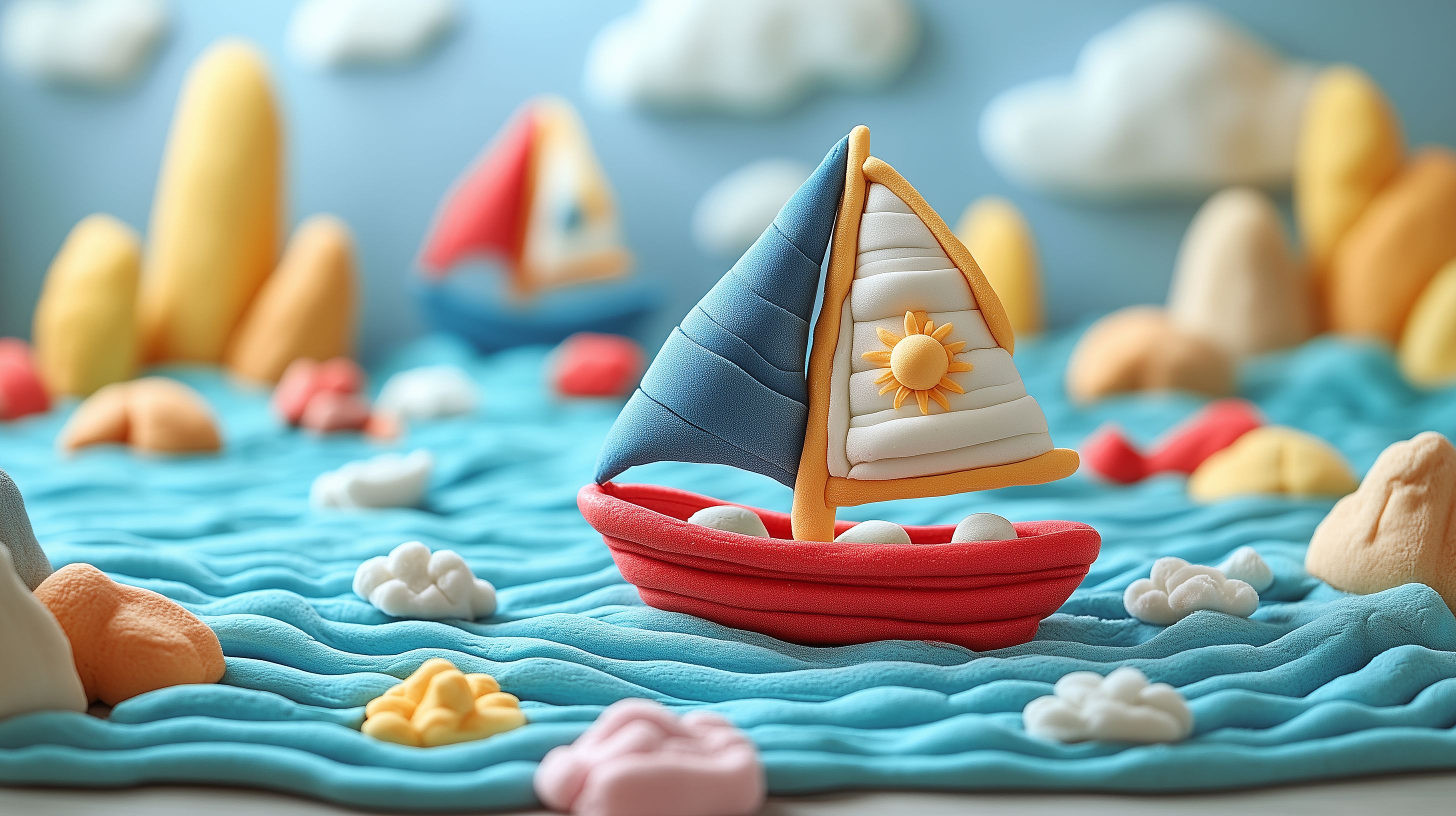 Das Bild zeigt ein kreativ gestaltetes Segelboot aus Knete, das auf einer Wellendarstellung auf einem blauen Hintergrund mit Wolken schwimmt. Das bunte, detailreiche Spielzeug transportiert eine Atmosphäre von Kinderfreude und Fantasie. Die farbenfroh-abstrakte Komposition lässt sich hervorragend als kostenloses Stockfoto in hoher Auflösung für verschiedene Zwecke wie Blog-Beiträge, Newsletter-Illustrationen oder Social-Media-Posts verwenden. Das Bild steht unter der Creative-Commons-Lizenz zur freien Nutzung bereit.