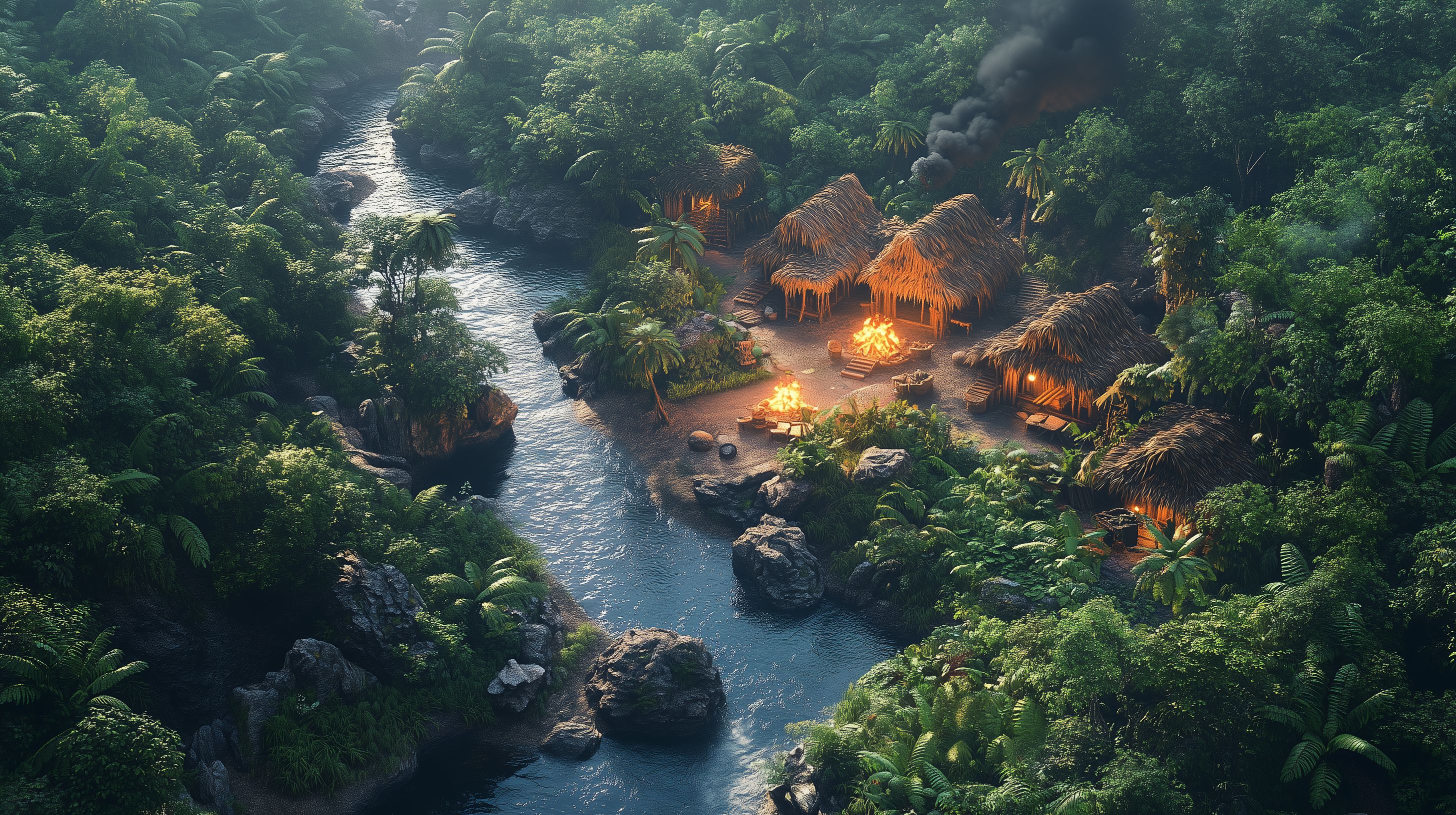 Das Foto zeigt eine idyllische Szene tief im tropischen Regenwald. Ein kleiner Fluss schlängelt sich durch das üppige Grün der Vegetation, flankiert von bizarr geformten Felsen. Auf der Uferseite sind mehrere traditionelle Hütten mit Strohdächern zu sehen, deren Lagerfeuer eine warme Atmosphäre verbreiten. Die Stimmung ist friedlich und einladend, perfekt für ein Dschungelabenteuer oder einen entspannenden Rückzugsort. Dieses hochauflösende, kostenlose Stockfoto eignet sich hervorragend für Blogs, Social Media-Beiträge, Werbekampagnen und andere visuelle Projekte unter Creative-Commons-Lizenz.