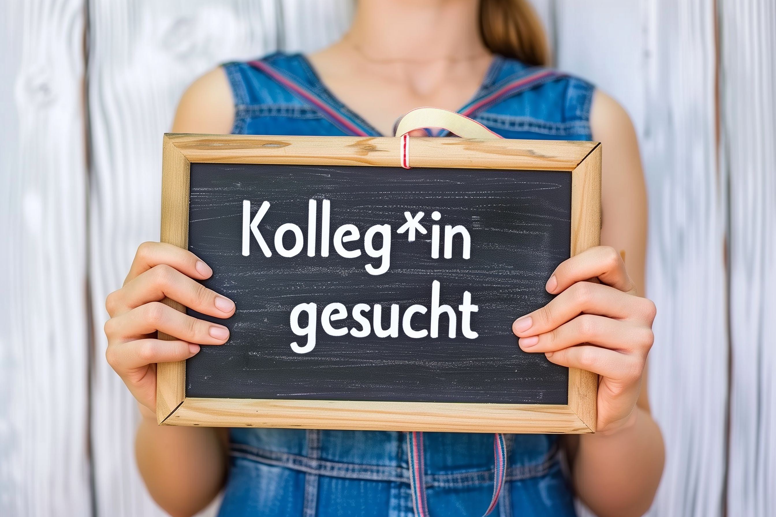 Das Bild zeigt eine Frau, die eine Tafel mit der Aufschrift 'Kolleg*in gesucht' in den Händen hält. Sie steht vor einer weißen Wand und trägt ein blaues Jeanskleid. Die Tafel hat einen Holzrahmen und ist mit Kreide beschriftet, was auf eine informelle, moderne Art der Stellenausschreibung hindeutet. Das Foto vermittelt einen zeitgemäßen und gendersensiblen Eindruck und könnte für Rekrutierung, Personalbeschaffung oder die Darstellung einer offenen Unternehmenskultur in Blogs, Newslettern oder sozialen Medien verwendet werden. Als hochwertiges, kostenloses Stockfoto unter Creative-Commons-Lizenz bietet es viele Möglichkeiten für Unternehmen und Organisationen, ihre Stellenanzeigen oder Karriereangebote gendersensibel und attraktiv zu präsentieren.