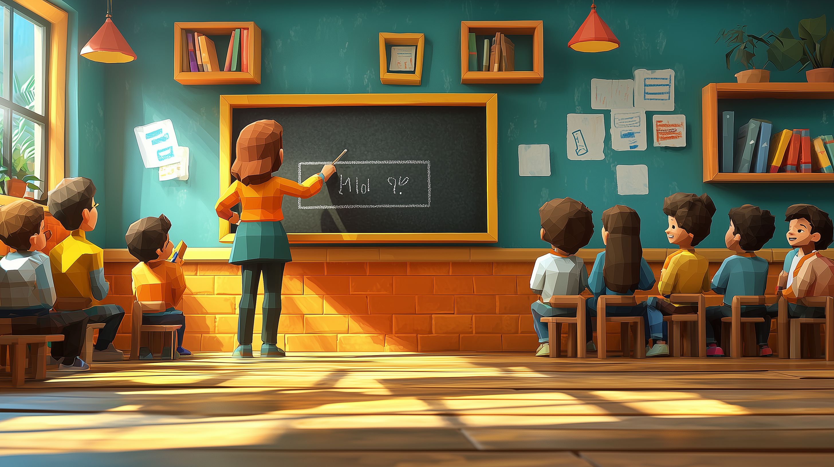 Das Bild zeigt eine bunte, geometrische Illustration eines Klassenzimmers. Ein Lehrer in orangefarbener Kleidung steht vor einer Tafel und erklärt etwas zu seinen Schülern, die in Bänken sitzen. Die Wände sind in einem kräftigen Türkiston gehalten, an denen Regale, Bilder und Dekorationen hängen. Das Bild vermittelt eine kreative und einladende Lernatmosphäre. Es eignet sich hervorragend als kostenloses Stockfoto für Blogbeiträge, Newsletter, Social-Media-Kanäle oder Werbematerial rund um die Themen Bildung, Schule und Lehre in hoher Auflösung und unter der Creative-Commons-Lizenz.