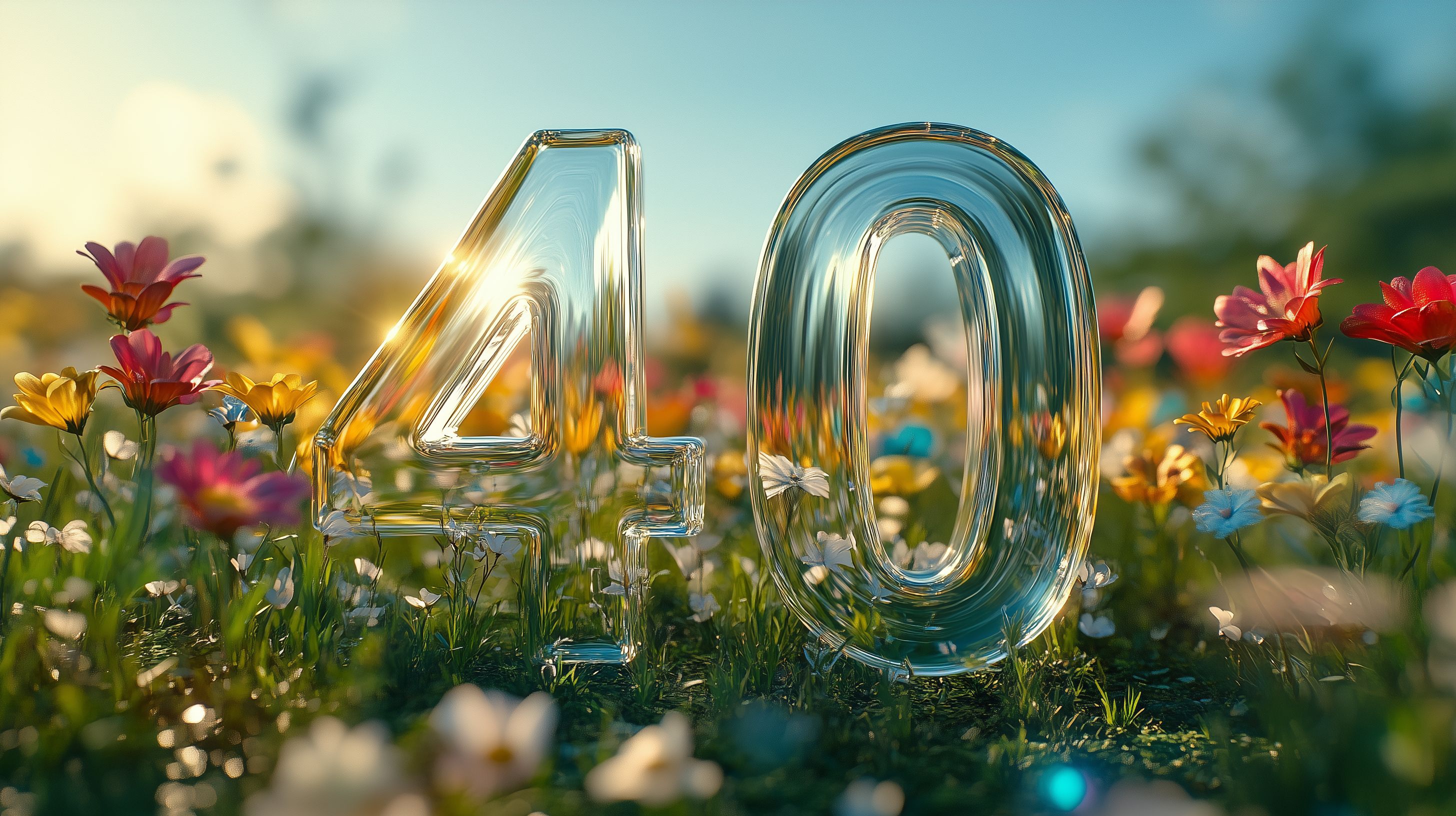 Dieses zauberhafte Stockfoto zeigt eine transparente, dreidimensionale Glasnummer '40' eingebettet in einem üppigen Blumenfeld. Die goldenen Ziffern reflektieren die Strahlen der untergehenden Sonne, die ein warmes, natürliches Licht über die Szenerie wirft. Die bunten Blüten in Rottönen, Gelb und Weiß verleihen dem Motiv einen sommerlich-romantischen Charakter. Dieses Bild eignet sich hervorragend für die Gestaltung von Hochzeits-, Jubiläums- oder Geburtstagskarten, Einladungen, Newslettern und Social-Media-Beiträgen. Als hochauflösendes, kostenloses Stockfoto unter der Creative-Commons-Lizenz kann es vielfältig eingesetzt werden.