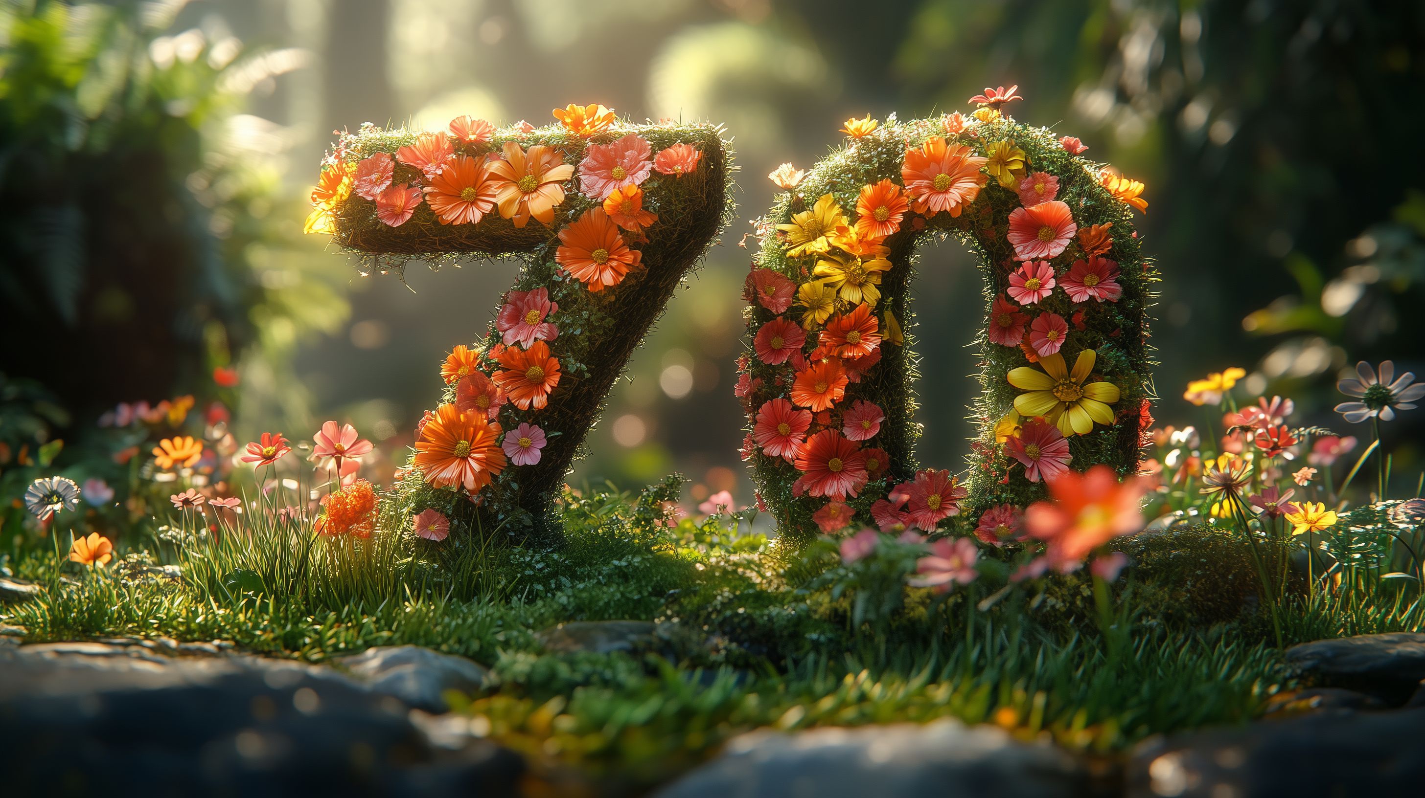 Dieses faszinierende Bild zeigt eine kunstvoll gestaltete Blumeninstallation in Form der Zahl 70, eingebettet in eine idyllische Waldlandschaft. Die üppige Anordnung von orangefarbenen, roten und gelben Gerbera-Blüten auf einem bemoosten Untergrund verleiht dem Motiv eine natürliche, organische Ausstrahlung. Die Lichtverhältnisse und der Fokus auf die zentrale Zahl erzeugen eine stimmungsvolle, fast magische Atmosphäre. Dieses kostenlose Stockfoto in hoher Auflösung eignet sich hervorragend für die Gestaltung von Hochzeitsinspirationen, Geburtstagsgrüßen, Jubiläumsankündigungen oder dekorativen Elementen in Blogs, Newslettern und Social-Media-Beiträgen. Die Verwendung der Aufnahme unterliegt den Creative-Commons-Lizenzbedingungen.