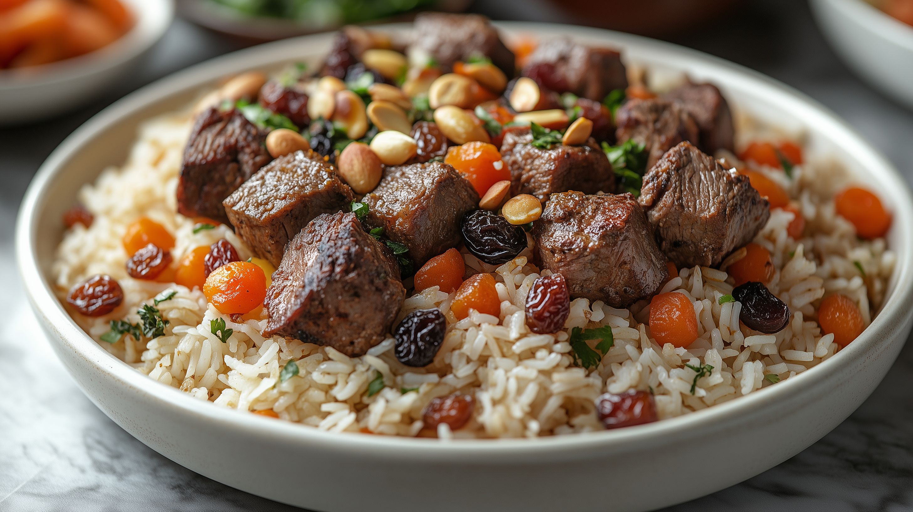 Dieses Foto zeigt ein köstliches Gericht der afghanischen Küche: Kabuli Pilaf. Es besteht aus gewürztem Lamm, Reis, Rosinen, Nüssen und frischen Kräutern. Das Gericht wird in einer rustikalen, weißen Schüssel serviert, was dem Bild einen appetitlichen und authentischen Look verleiht. Die Zutaten sind farblich stimmig arrangiert und vermitteln den Eindruck eines frischen, schmackhaften Gerichts. Dieses Stockfoto eignet sich hervorragend für Blogs, Kochrezepte, Werbung oder Social-Media-Beiträge rund um orientalische Gerichte und authentische Küche.
