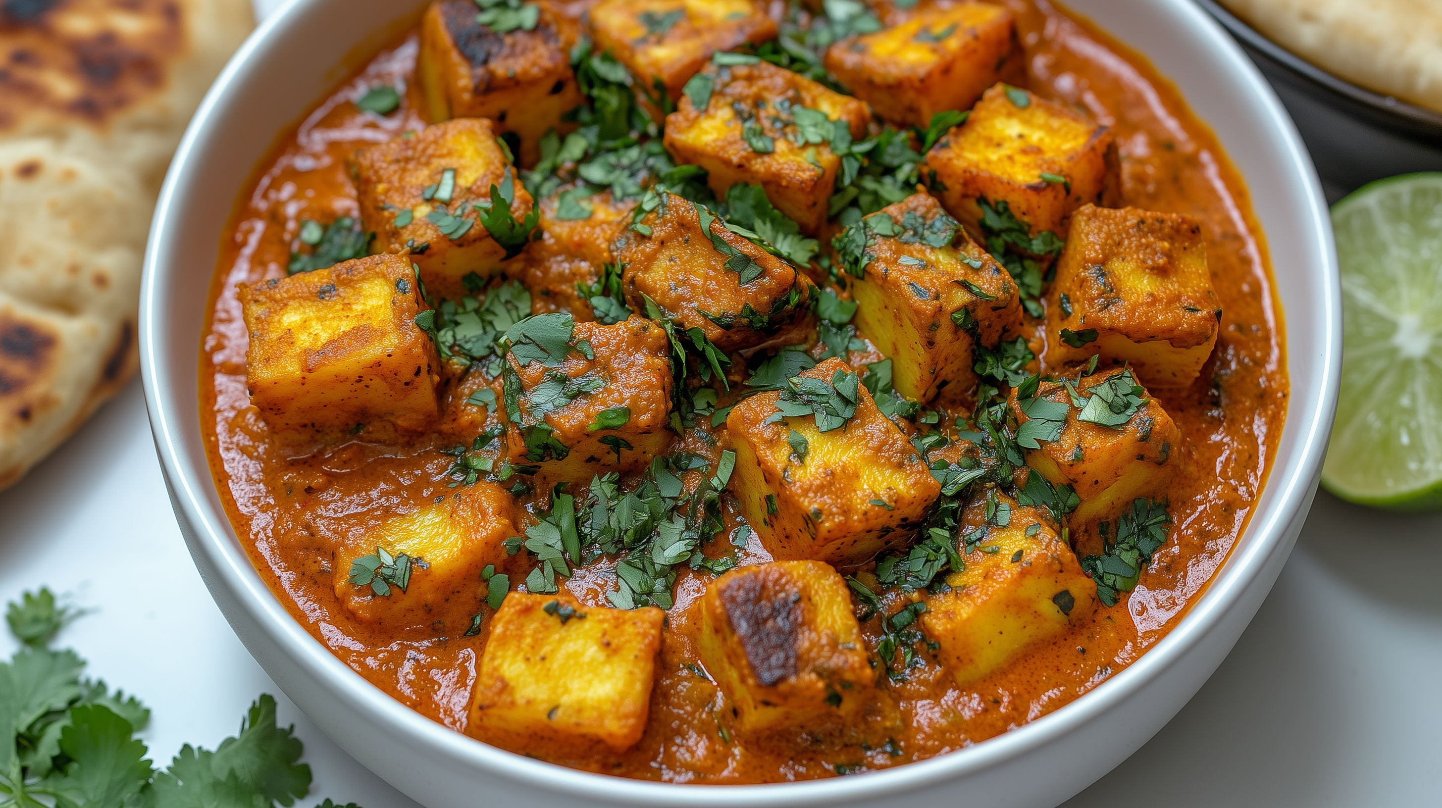 Dieses Foto zeigt ein köstliches Tikka-Masala-Gericht mit würzigen, goldbraunen Kartoffelwürfeln, die in einer reichhaltigen, tomatigen Sauce schwimmen. Frisch gehackter Koriander verleiht dem Gericht eine aromatische Note. Die Zutaten sind in einer hellen, runden Schüssel angerichtet, was eine einladende und appetitliche Präsentation ergibt. Dieses hochwertige Stockfoto in hoher Auflösung eignet sich perfekt für die Verwendung in Blogs, Social-Media-Beiträgen, Kochrezepten oder Werbematerialien rund um indische Küche, vegetarische Gerichte oder leckere Mittagessen. Das Foto ist unter einer Creative-Commons-Lizenz frei nutzbar.