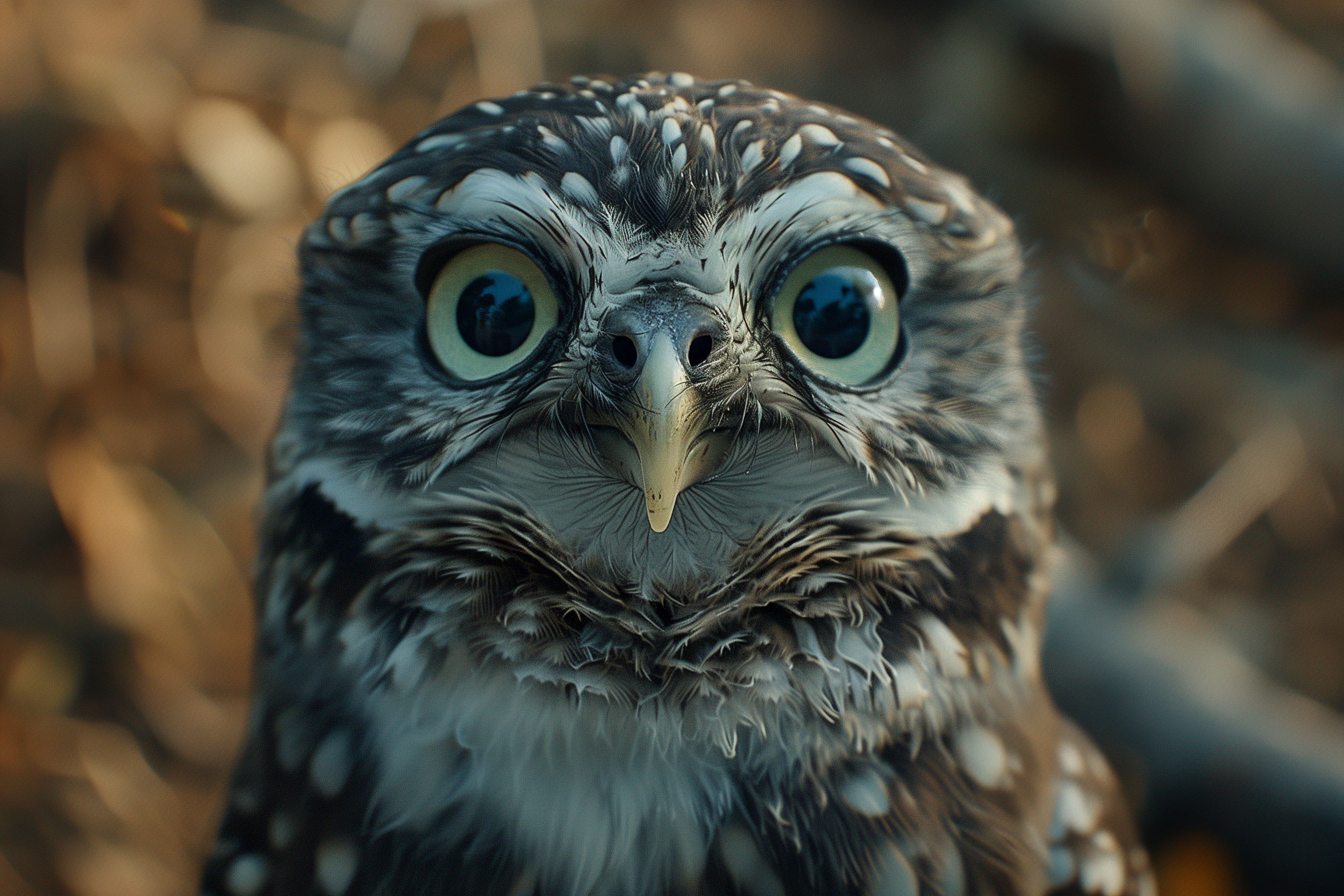 Dieses Bild zeigt eine faszinierende Nahaufnahme eines Eulenkopfes. Aus einem Hintergrund von verschwommenen Formen und Farben tritt das auffallende Gesicht des Vogels klar und deutlich hervor. Die großen, aufmerksamen Augen und das dichte, gefleckte Gefieder verleihen dem Tier einen neugierigen und fast menschlichen Ausdruck. Die scharfe Fokussierung auf den Kopf und die weiche Unschärfe im Hintergrund lenken den Blick des Betrachters gezielt auf die Details des Eulengesichts.