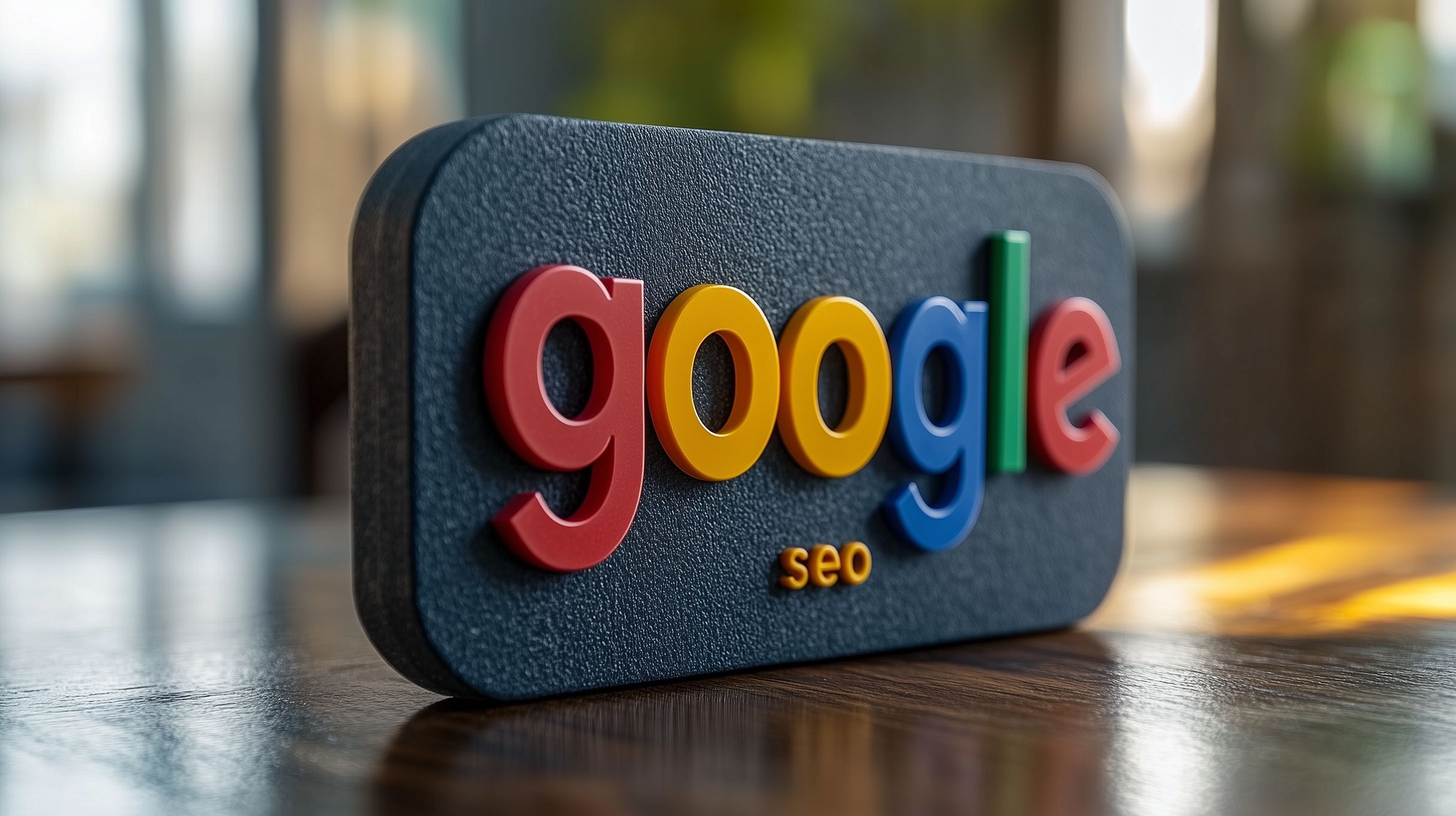 Das Bild zeigt das ikonische Google-Logo in einer minimalistischen, SEO-optimierten Darstellung auf einem dunklen Holztisch. Das farbenfrohe Design hebt sich kontrastreich vom dunklen Hintergrund ab und legt den Fokus auf den Begriff 'SEO', was für Suchmaschinenoptimierung steht. Dieses Stockfoto eignet sich ideal für Beiträge, Newsletter oder Social-Media-Posts rund um Themen wie Online-Marketing, Digitales Branding oder Webentwicklung. Als hochwertiges, kostenloses Bild unter Creative Commons-Lizenz kann es ohne Einschränkungen verwendet werden.