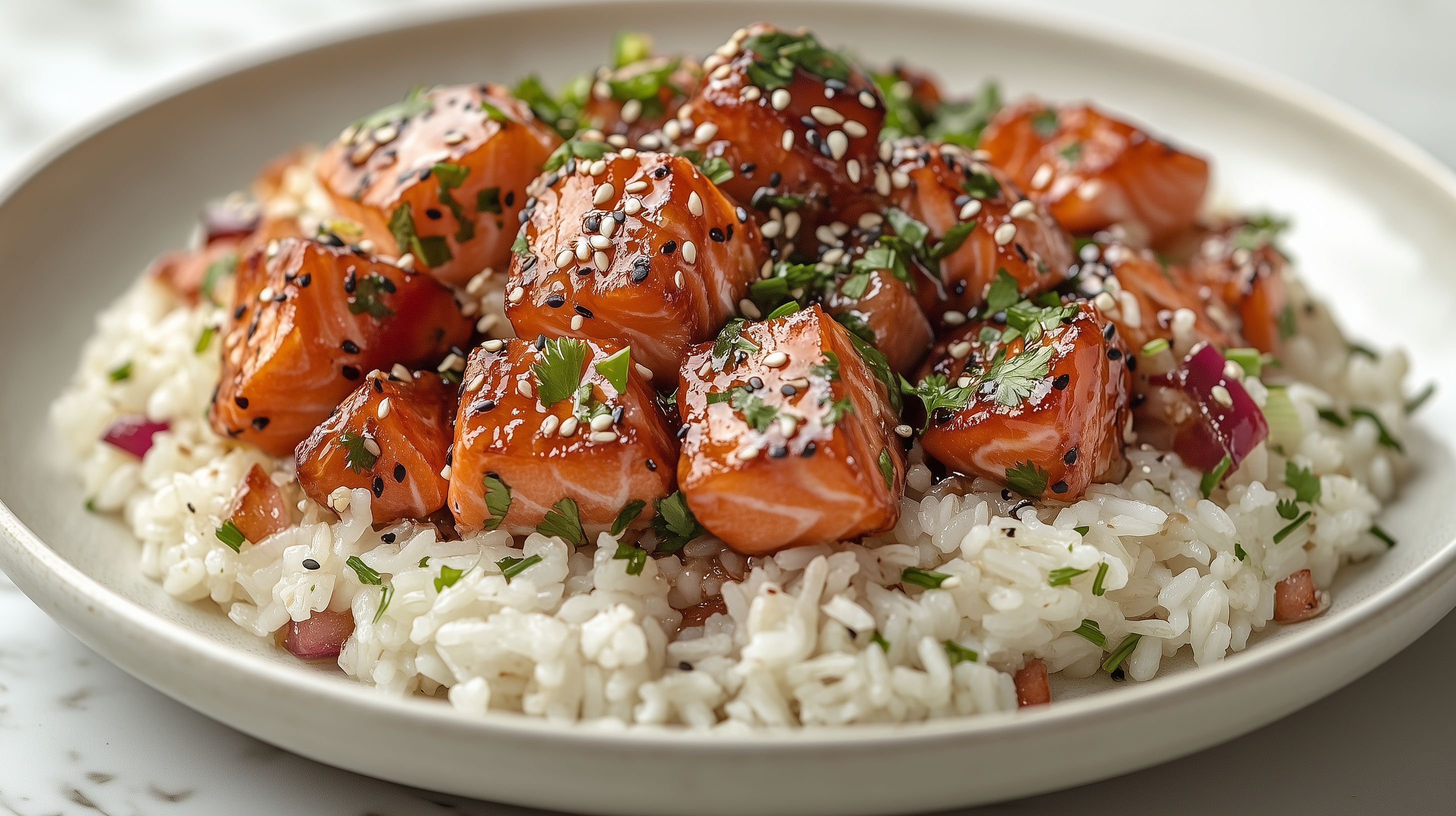 Das Foto zeigt einen appetitlichen Reisteller mit geräuchertem Lachs, der in einer köstlichen Teriyaki-Sauce serviert wird. Die Lachsportionen sind mit knusprigen Sesamkörnern bestreut und mit frischen Kräutern garniert, was dem Gericht eine moderne, asiatische Note verleiht. Der Reis ist locker und fluffig, sodass die verschiedenen Texturen und Aromen optimal zur Geltung kommen. Dieses Foto eignet sich hervorragend für Blogs, Kochrezepte oder Werbung für gesunde und abwechslungsreiche Ernährung. Als kostenloses Stockfoto in hoher Auflösung unter Creative-Commons-Lizenz kann es vielfältig eingesetzt werden.