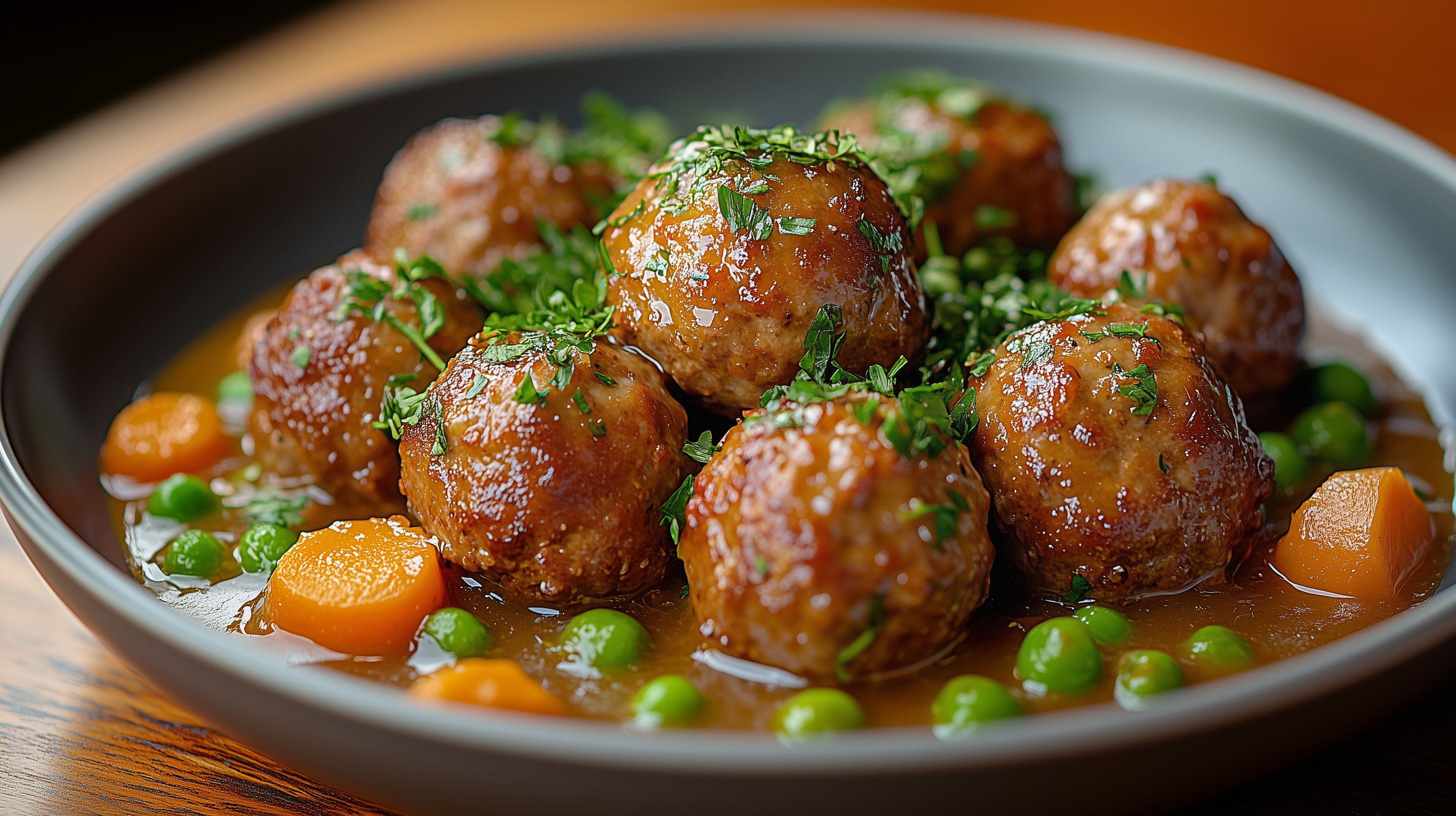 Dieses Foto zeigt eine delikate Platte mit köstlichen Fleischbällchen in einer üppigen, aromatischen Tomatensoße, umgeben von frischen Erbsen und Karotten. Die Bällchen sind appetitlich golden-braun und mit gehackter Petersilie garniert, was dem Gericht eine frische Note verleiht. Die rustikale Optik und die dunkle, kontrastreiche Farbgebung verleihen dem Bild einen stimmungsvollen, heimischen Charakter. Dieses hochwertige Stockfoto in hoher Auflösung eignet sich perfekt für die Verwendung in Blogs, Newslettern, Social-Media-Beiträgen oder Werbekampagnen rund um traditionelle Hausmannskost, Comfort Food und schmackhafte Hauptgerichte. Es steht unter einer Creative-Commons-Lizenz zur kostenlosen Nutzung zur Verfügung.