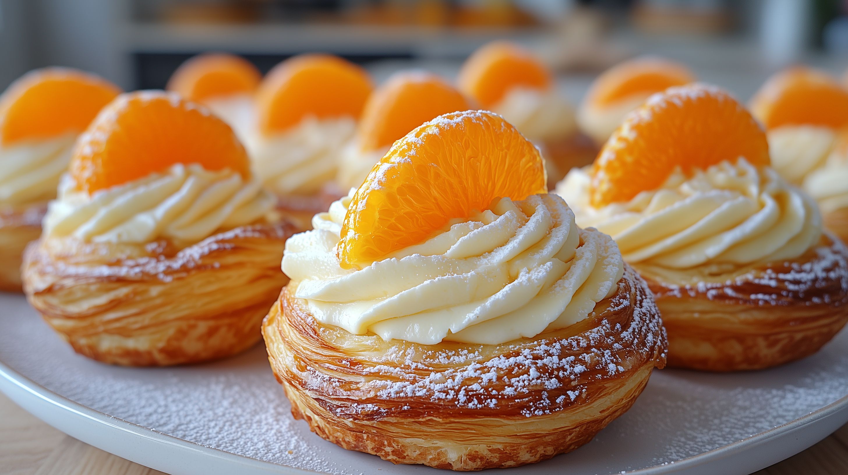 Das Bild zeigt eine Auslage von frisch gebackenen Orangenkuchen mit cremiger Füllung. Die knusprigen, goldbraunen Gebäckstücke sind mit einer feinen Schicht Orangencreme dekoriert und mit frischen Orangenscheiben garniert. Die Kuchen sind auf einem hellen Holzteller angerichtet und verströmen ein appetitliches, frisches Aroma. Die stimmungsvolle, saisonale Optik und das hochwertige Aussehen der Backwaren lassen sie als ideale Zutat für Foodfotografie, Kochbücher, Blogbeiträge oder Social-Media-Posts erscheinen. Dieses kostenlose Stockfoto in hoher Auflösung unter der Creative-Commons-Lizenz bietet viele Einsatzmöglichkeiten für Unternehmen aus den Bereichen Gastronomie, Backwaren, Lebensmittel oder Lifestyle.