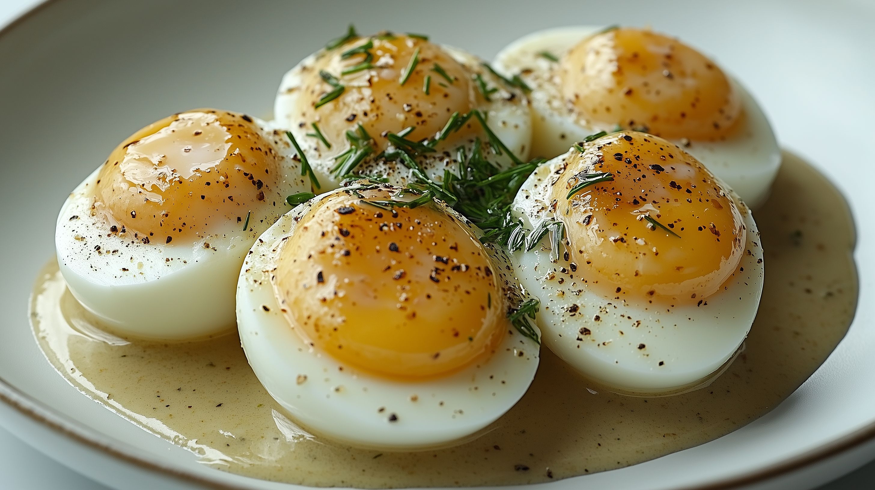 Dieses Foto zeigt eine Anordnung servierter Eier in einer cremigen Estragonsauce auf einem hellen Teller. Die Eier sind halbiert und haben eine goldgelbe, glänzende Eigelboberfläche. Um die Eier herum sind frische Kräuter wie Petersilie dekorativ angeordnet. Das Gericht hat eine rustikale, hausgemachte Optik und wirkt natürlich und appetitlich. Das Foto eignet sich hervorragend als kostenloses Stockfoto in hoher Auflösung für Blogs, Newsletter, Social-Media-Beiträge oder Werbematerial im Bereich Frühstück, Brunch oder gesunde Ernährung. Es steht unter einer Creative-Commons-Lizenz zur Verfügung.