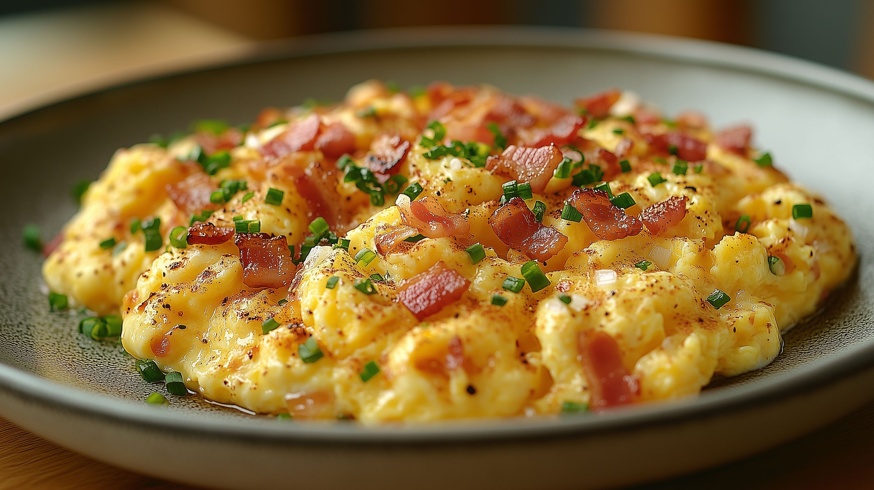 Das Foto zeigt ein köstliches Rührei, das mit knusprigen Speckwürfeln und frischem Schnittlauch garniert ist. Die Speise wird in einer rustikalen Tellerschale angerichtet, was ihr eine natürliche und einladende Optik verleiht. Das Rührei schimmert cremig und die Speckstückchen sorgen für einen leckeren Kontrast. Dieses appetitliche Gericht eignet sich hervorragend als Foto für Blogs, Onlineshops, Social-Media-Kanäle oder Werbekampagnen rund um das Thema Frühstück, Brunch oder Mittagessen. Das hochauflösende Stockfoto steht unter einer Creative-Commons-Lizenz zur freien Verwendung zur Verfügung.