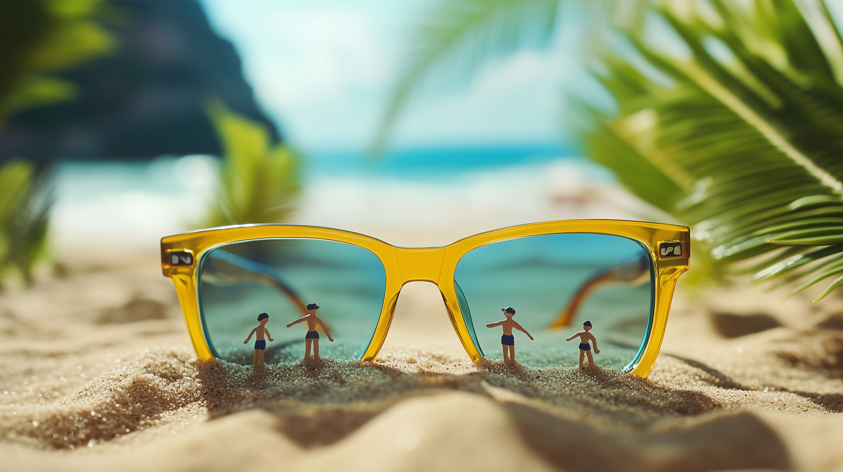 Dieses Foto zeigt eine sommerliche Strandszene, die durch eine Sonnenbrille mit gelben Rahmen betrachtet wird. In der Linse der Brille sind Miniaturfiguren zu sehen, die im Sand am Strand stehen, umgeben von Palmen und dem türkisblauen Ozean. Die ungewöhnliche Perspektive und das Spiel mit Maßstäben erzeugen einen kreativen, konzeptuellen Charakter. Das Bild könnte perfekt für Blogs, Social-Media-Beiträge, Werbematerial oder Urlaubsthemen verwendet werden. Dieses hochauflösende Stockfoto ist unter einer kostenlosen Creative-Commons-Lizenz verfügbar.