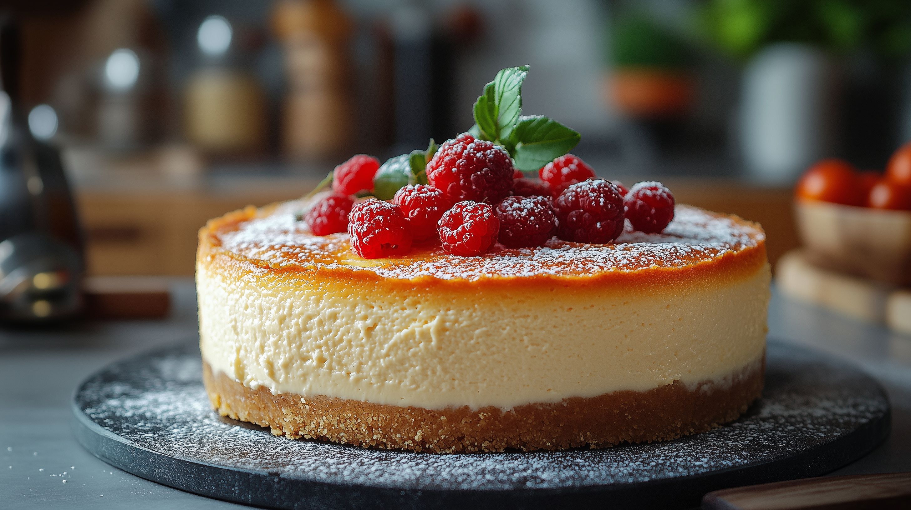 Das Foto zeigt einen leckeren, frisch zubereiteten Käsekuchen, der mit roten, frischen Himbeeren und feinem Puderzucker dekoriert ist. Der Kuchen hat eine cremige Konsistenz und eine goldbraune Oberfläche, die ihn sehr appetitlich erscheinen lässt. Er steht auf einem dunklen Holzbrett, was dem Bild eine rustikale Note verleiht. Das Foto eignet sich hervorragend als Stockfoto für Backrezepte, Desserts, Lebensmittelfotos oder zur Verwendung in Blogs, Newslettern oder Werbematerialien. Die hochauflösende Aufnahme steht unter einer Creative-Commons-Lizenz und kann kostenfrei genutzt werden.