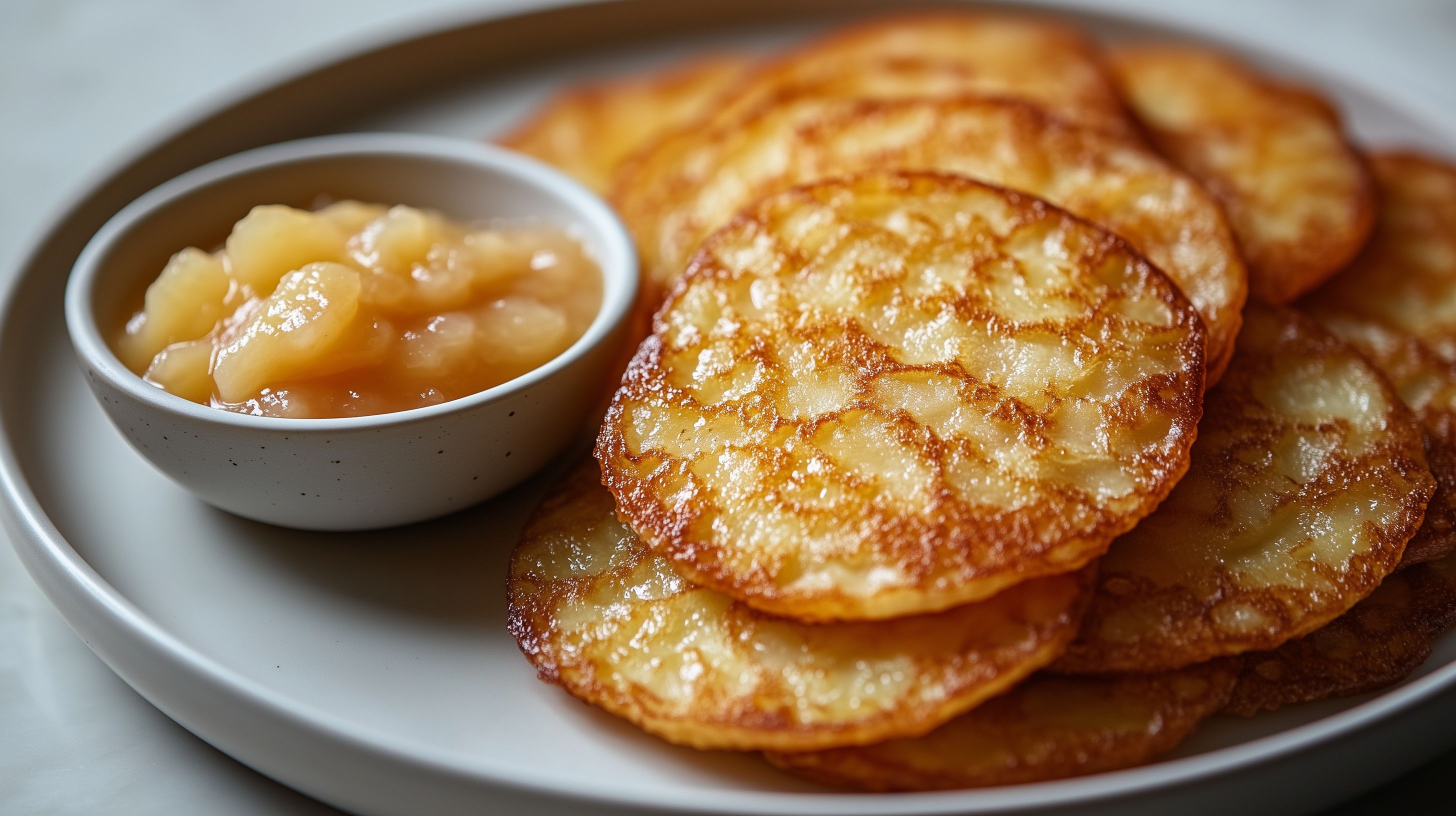 Das Foto zeigt eine Platte mit knusprig goldbraunen Kartoffelpuffern, die zusammen mit einer Portion Apfelmus angerichtet sind. Die Puffer haben eine leicht krümelige Oberfläche und eine saftige, luftige Konsistenz im Inneren. Das Apfelmus, das in einer separaten Schale serviert wird, hat eine schöne, cremige Textur und eine leicht süßliche Note. Dieses rustikale Gericht eignet sich hervorragend als Frühstück, Mittagessen oder Snack und lässt sich vielfältig in Blogs, Newslettern oder Werbekampagnen einsetzen. Dieses hochauflösende, kostenlose Stockfoto unter Creative-Commons-Lizenz bietet eine authentische und appetitanregende Darstellung des traditionellen Kartoffelpuffer-Gerichts.