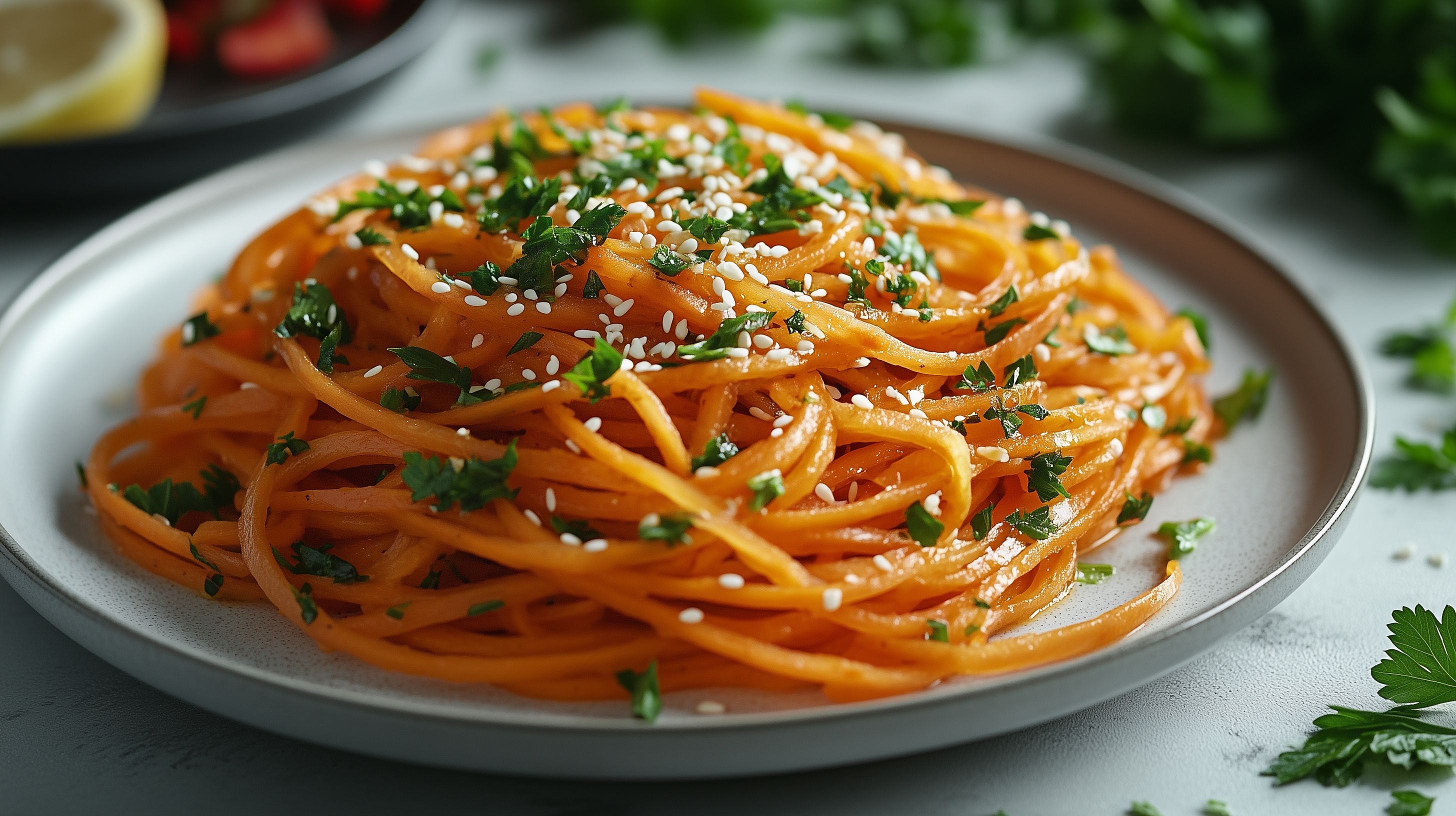 Dieses Foto zeigt einen frischen, knackigen Karottensalat, der mit gehackter Petersilie und gerösteten Sesamkörnern garniert ist. Die Karotten sind in feine Streifen geschnitten und schimmern in einem kräftigen Orange. Der Salat wurde auf einem weißen Keramikteller angerichtet, wodurch die Farben und Zutaten besonders gut zur Geltung kommen. Das Foto hat eine natürliche, rustikale Anmutung und eignet sich hervorragend als kostenloses Stockfoto für Blogger, Social-Media-Kanäle oder Werbekampagnen rund um gesunde Ernährung und Lebensmittel. Die hochauflösende Datei steht unter der Creative-Commons-Lizenz zur Verfügung.