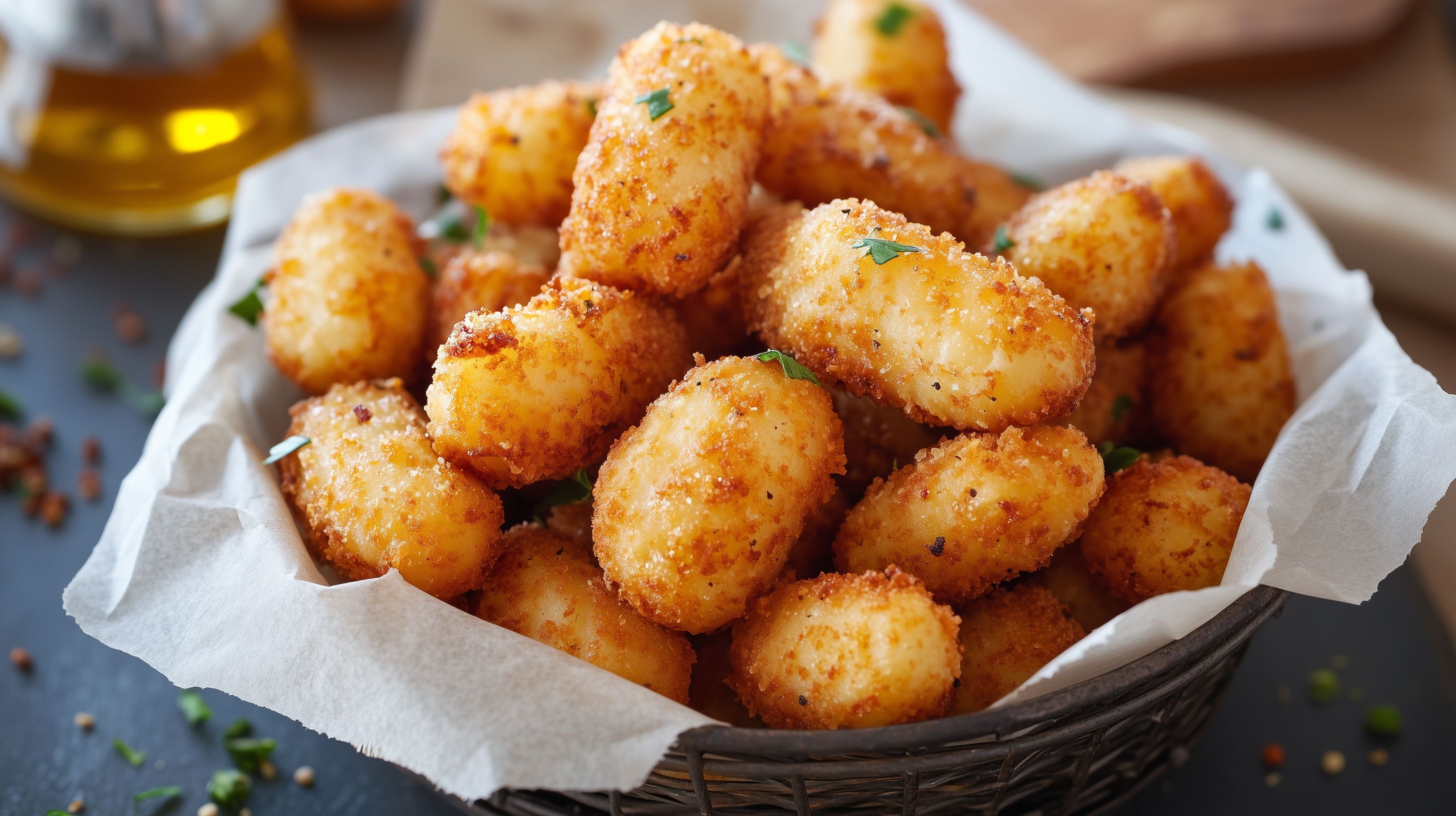 Das Bild zeigt eine Servierschale voller knuspriger Tatar-Bällchen, sogenannter 'Tater Tots'. Die goldbraun fritierte Kartoffelspezialität ist mit feinen Gewürzen verfeinert und wird in einer rustikalen, mit Textil ausgelegten Holzschale serviert. Die Komposition aus den würzig-knusprigen Kartoffelkugeln, der natürlichen Servierschale und den dekorativen Gewürzkörnern verleiht dem Foto einen appetitlichen, frischen und hochwertigen Eindruck. Dieses hochauflösende, kostenlose Stockfoto eignet sich hervorragend für Rezeptseiten, Foodblogs, Werbung und Social-Media-Beiträge rund um leckere Snacks und Fingerfood.