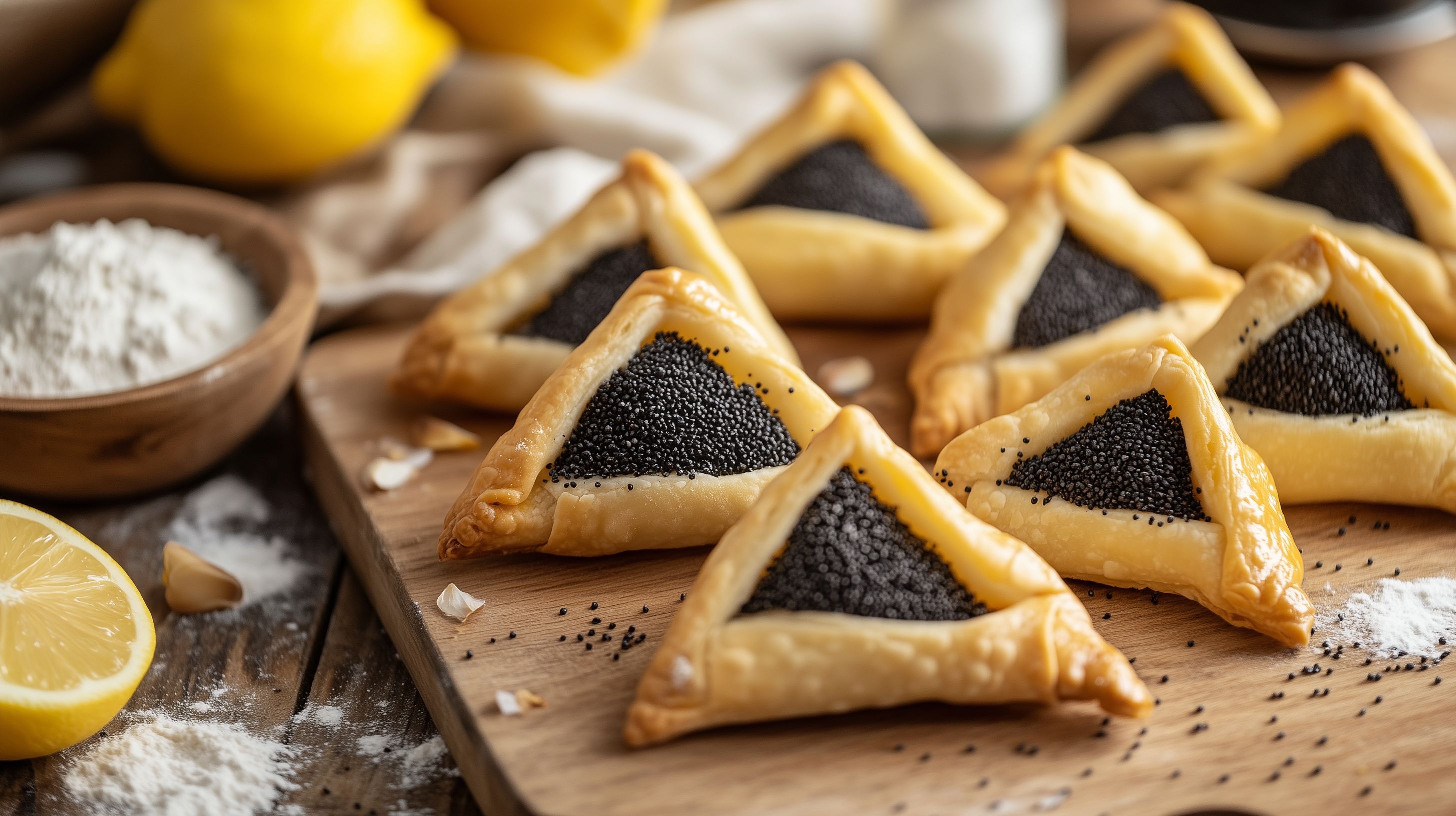 Das Foto zeigt eine Auswahl an dreieckigen Mohnkeksen, die auf einem Holzbrett angerichtet sind. Die Kekse haben eine typische Hamentaschen-Form mit einer schwarzen Mohnfüllung. Neben den Keksen sind noch einige Zitronen sowie ein Schälchen mit Mehl zu sehen. Das Arrangement vermittelt einen traditionellen, rustikalen Eindruck und würde sich hervorragend als Titelbild für einen Beitrag über traditionelle jüdische Backwaren, wie Hamentaschen, eignen. Das hochwertige Stockfoto in hoher Auflösung ist unter einer Creative-Commons-Lizenz frei verwendbar.