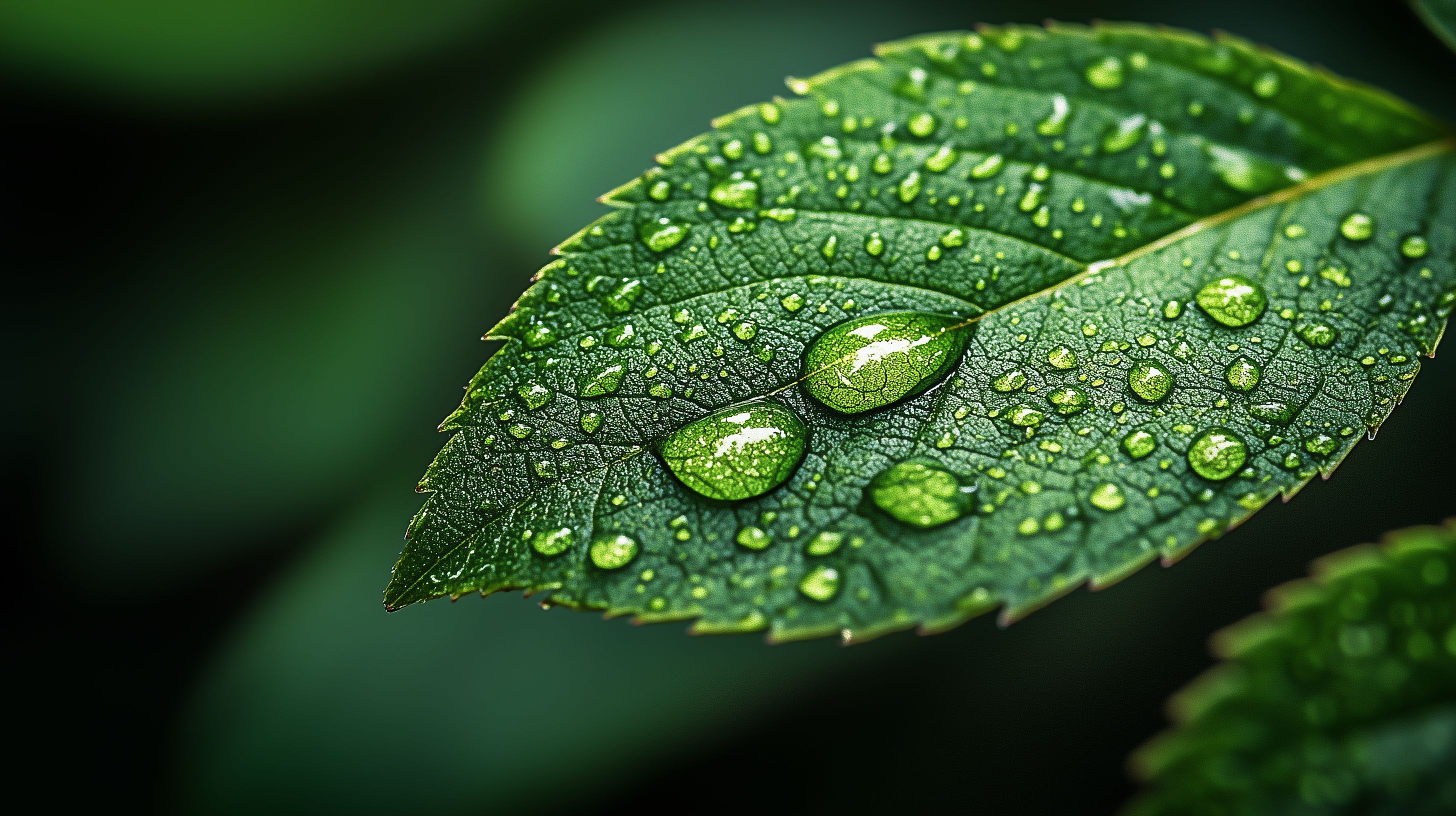 Dieses Foto zeigt ein grünes, glänzendes Blatt mit vielen kleinen Tautropfen, die darauf sitzen. Das Blatt ist in scharfer Fokussierung aufgenommen, sodass die Struktur und Textur der Blattoberfläche deutlich zu erkennen sind. Der dunkle, unscharfe Hintergrund lässt den Fokus ganz auf das Blatt und die Wassertropfen richten. Die Farben sind kräftig und lebendig, was das Foto sehr natürlich und frisch erscheinen lässt. Dieses kostenlose Stockfoto in hoher Auflösung kann vielfältig eingesetzt werden, etwa in Blogbeiträgen, Newslettern oder Werbematerialien zum Thema Natur, Umwelt oder Nachhaltigkeit. Es steht unter einer Creative Commons-Lizenz zur Verfügung.
